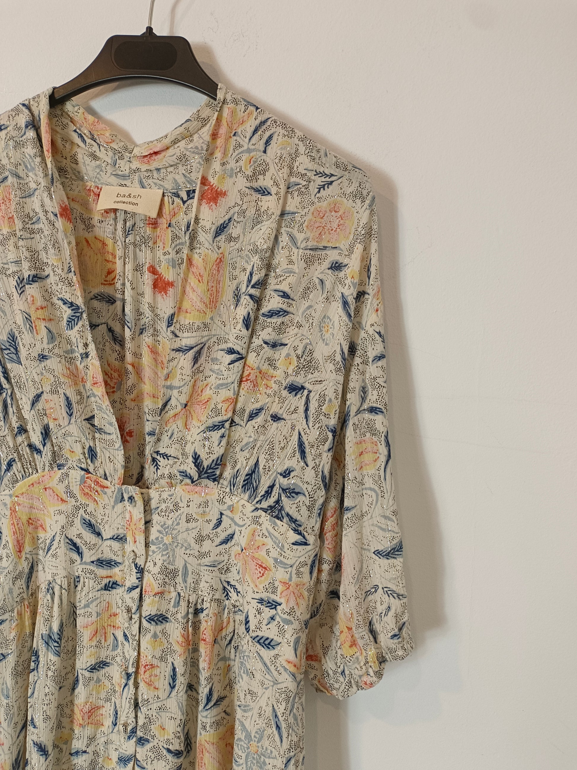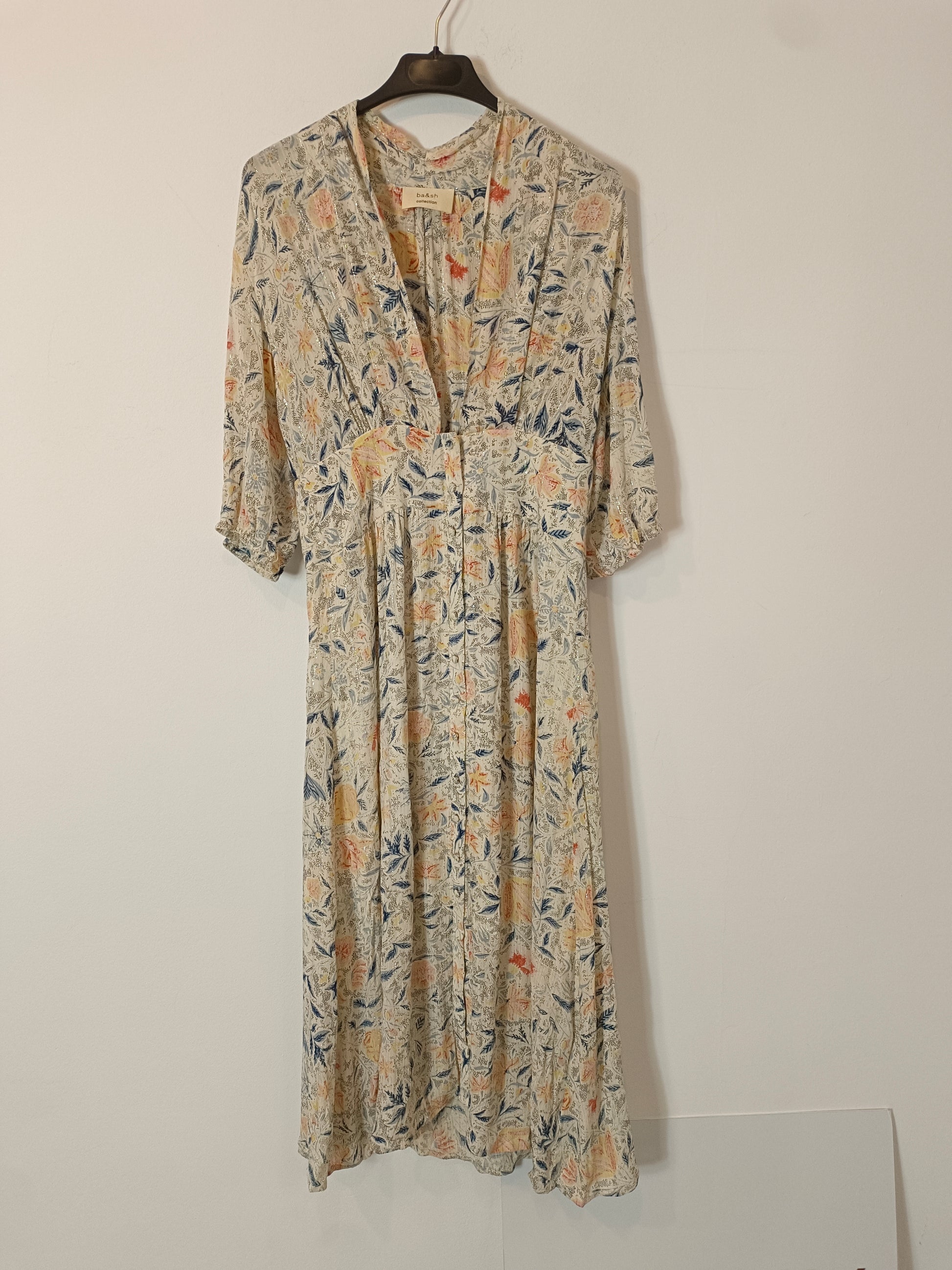 vestido largo fluido con estampado de flores y detalle de rayas plateadas