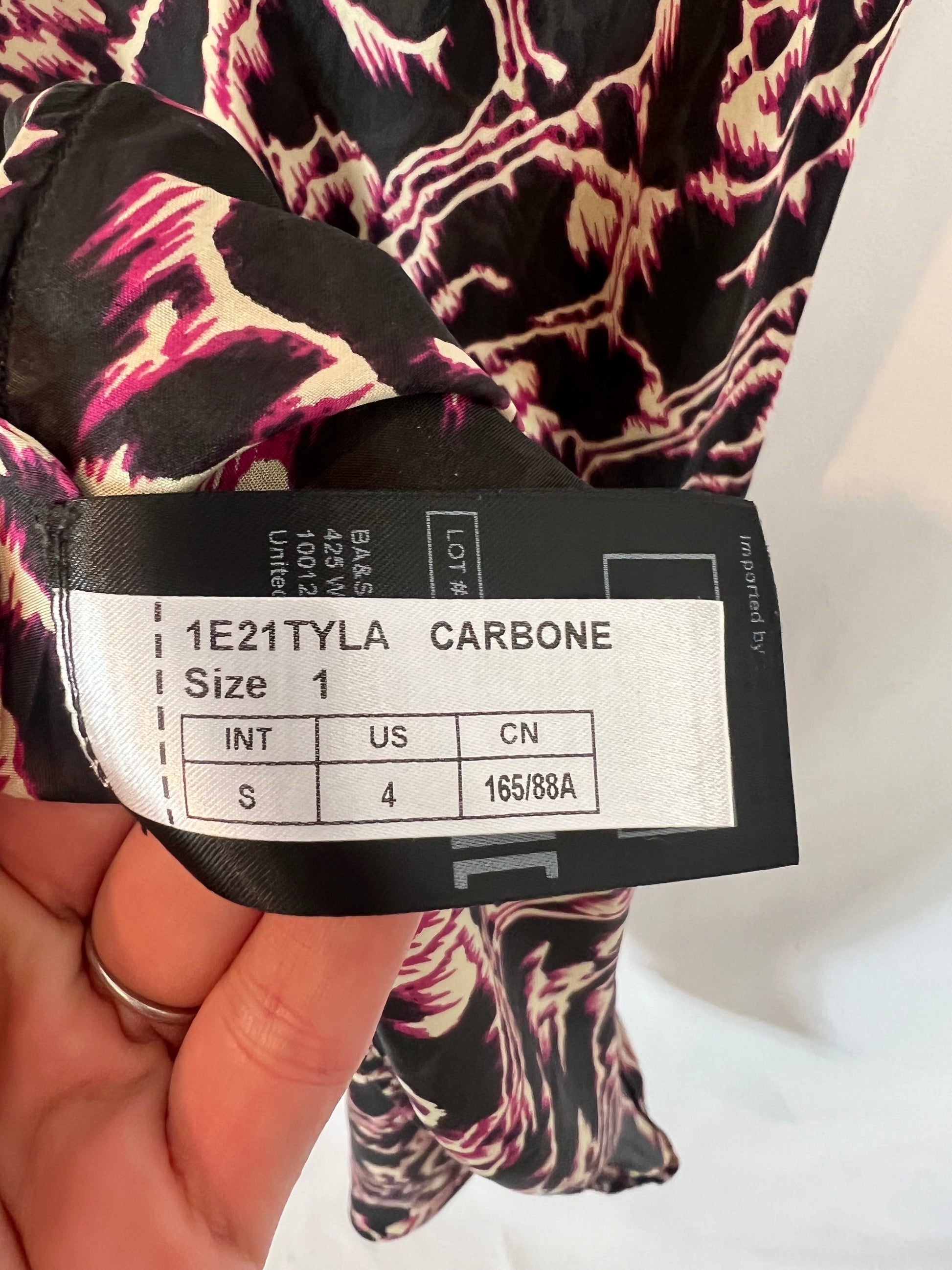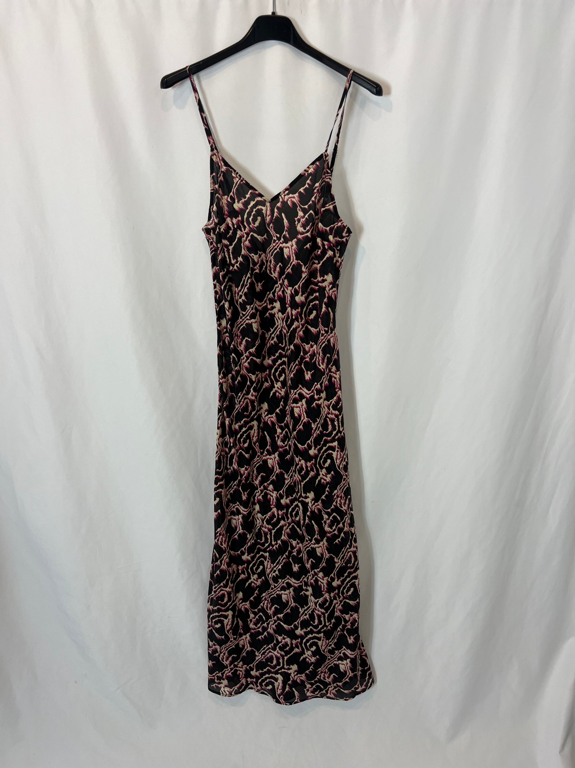 Vestido midi negro con estampado en rosa y blanco. Ligeramente transparente. De sisa a sisa 42cm, largo 132cm