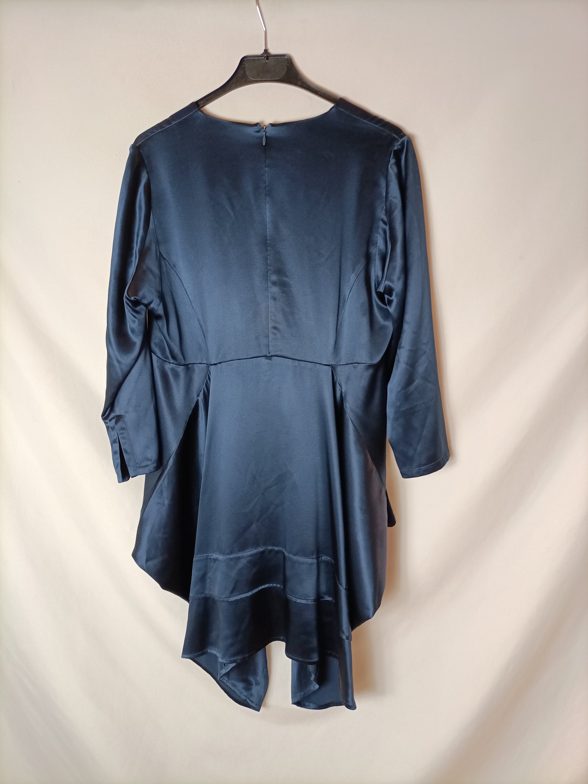 Vestido azul satinado asimétrico. Cremallera en la espalda. Tejido no elástico. Talla como una M/L