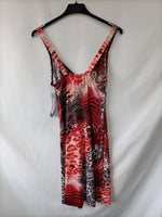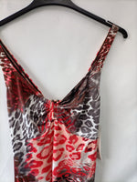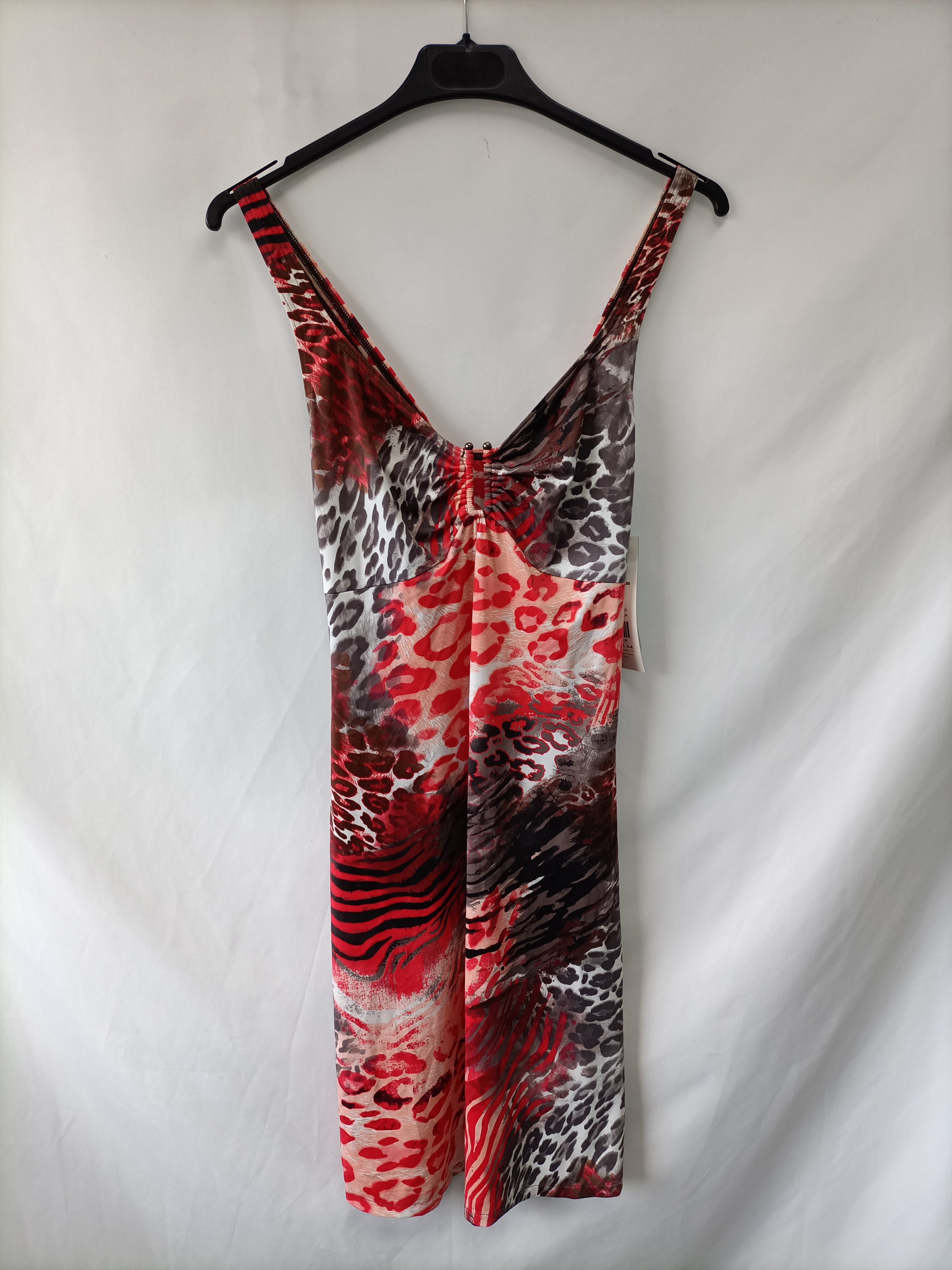 Vestido animal print en tonos rojos. Muy elástico de tejido tipo bañador. Es fluido y fino. Largo 93 cm