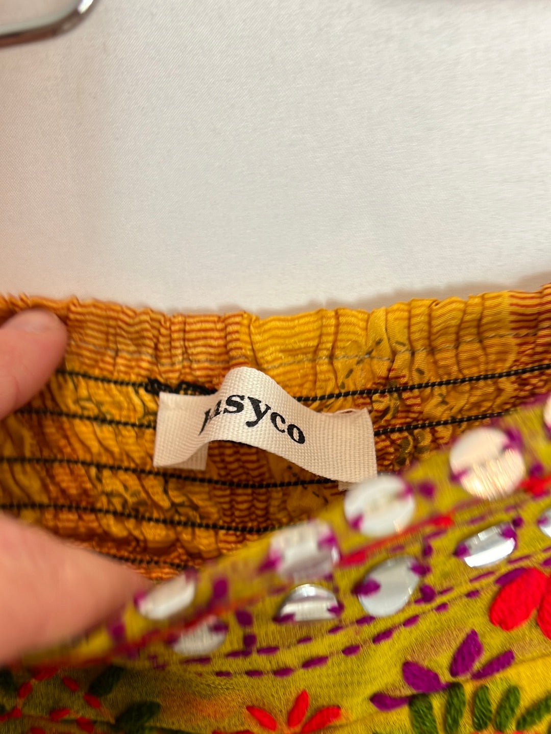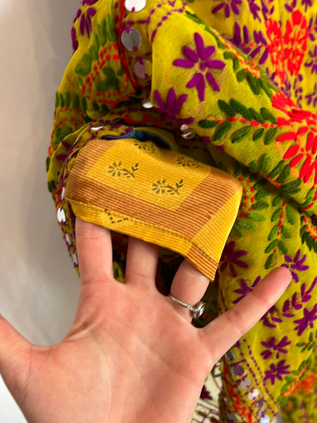 Pantalón amarillo bordado con pedrería colores. Cintura 36cm, Semi elastico. Largo 97cm. Flores terciopelo