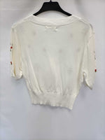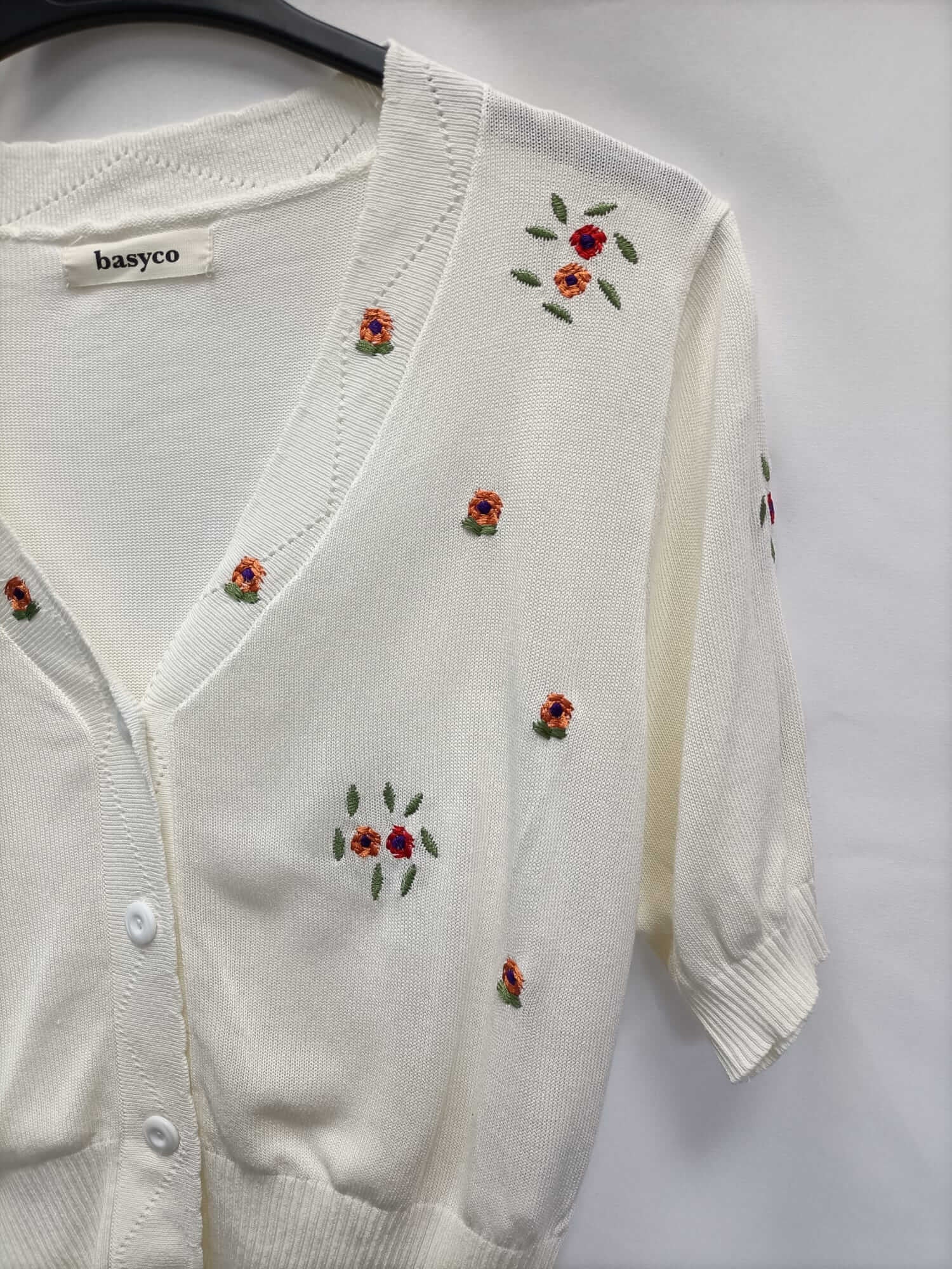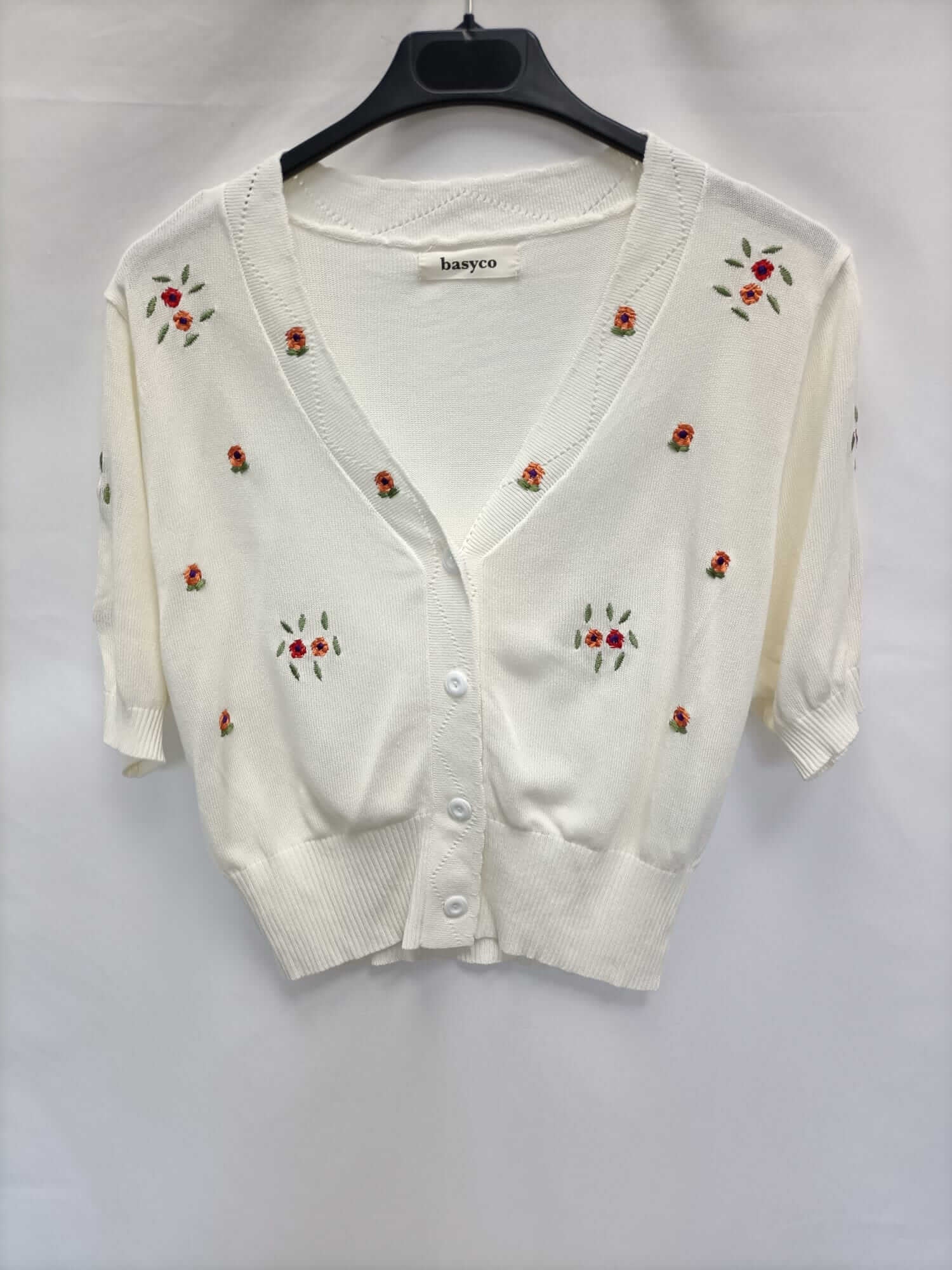 Basyco. Tu (s). Top de punto blanco roto con flores bordadas. Elastico y fino. Fluido. Largo 46 cmv