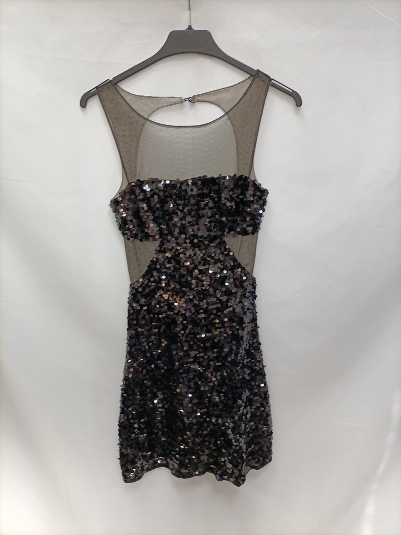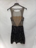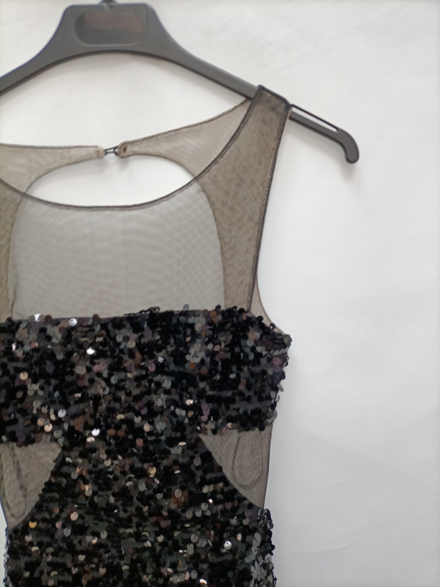Vestido de lentejuelas negro con la espalda al aire y los tirantes y escore de tul.