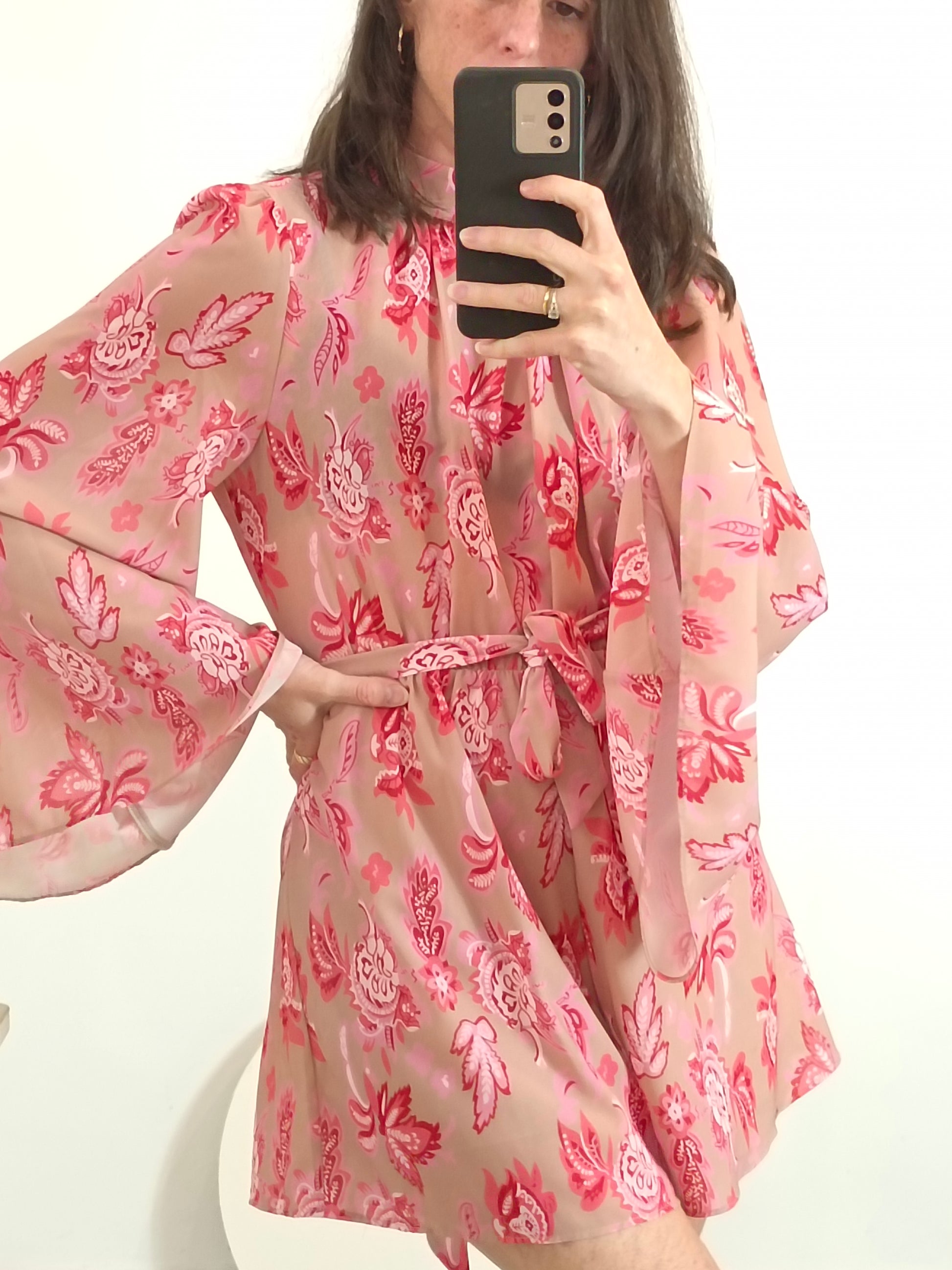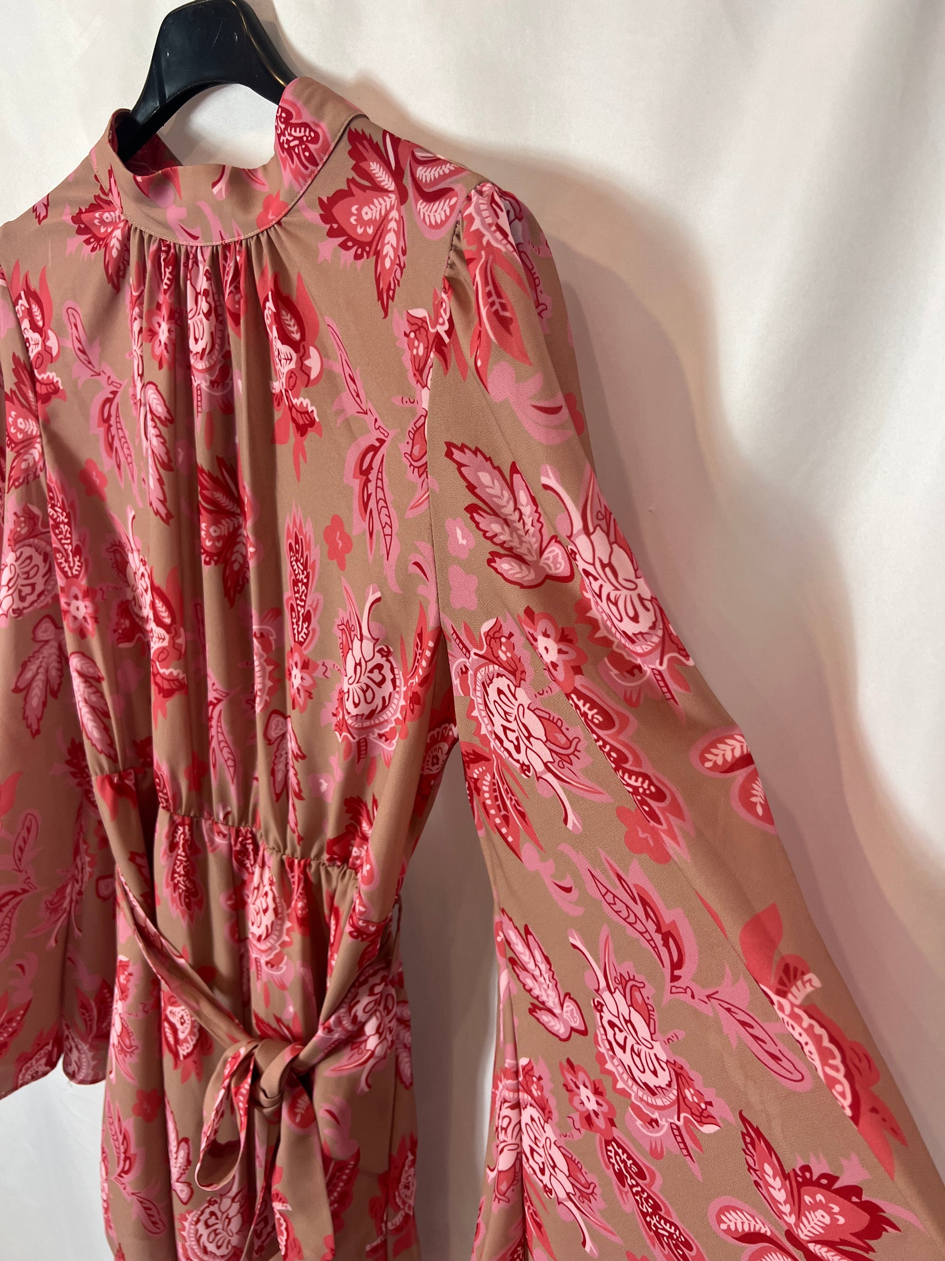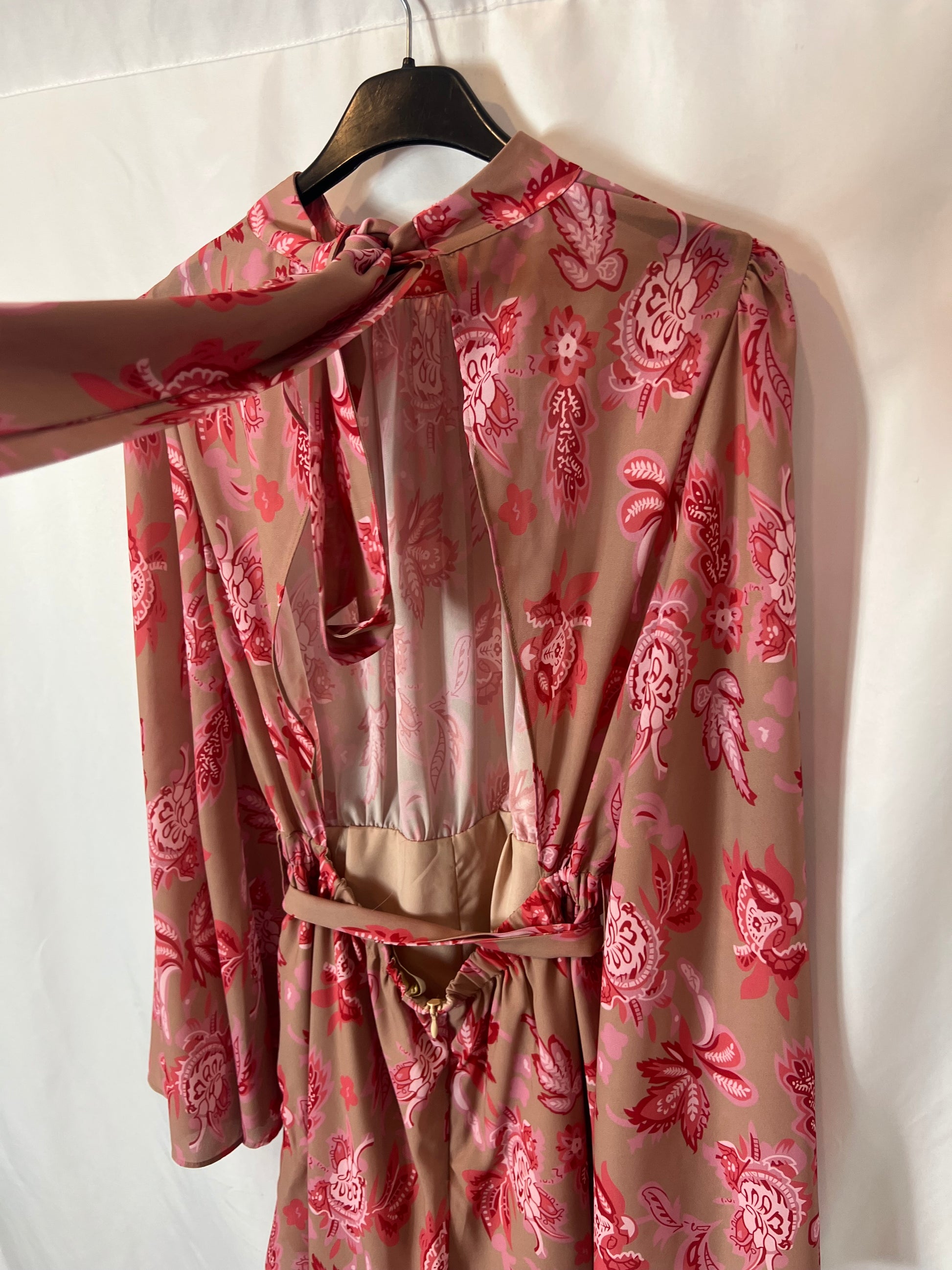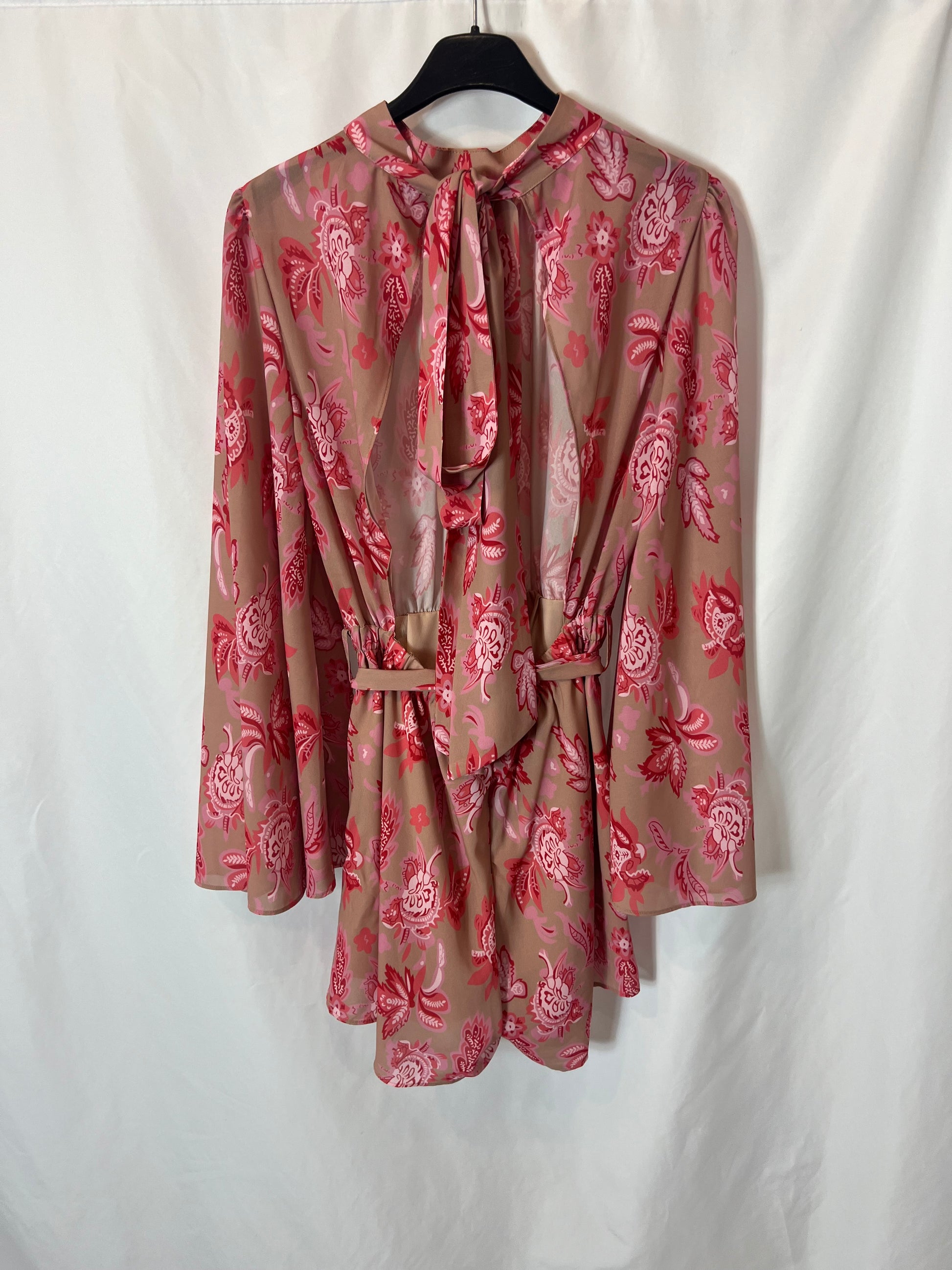 Mono beige estampado de flores con espalda al aire con lazada. espalda elástica y detalle de lazada de sisa a sisa 44cm, largo 85cm