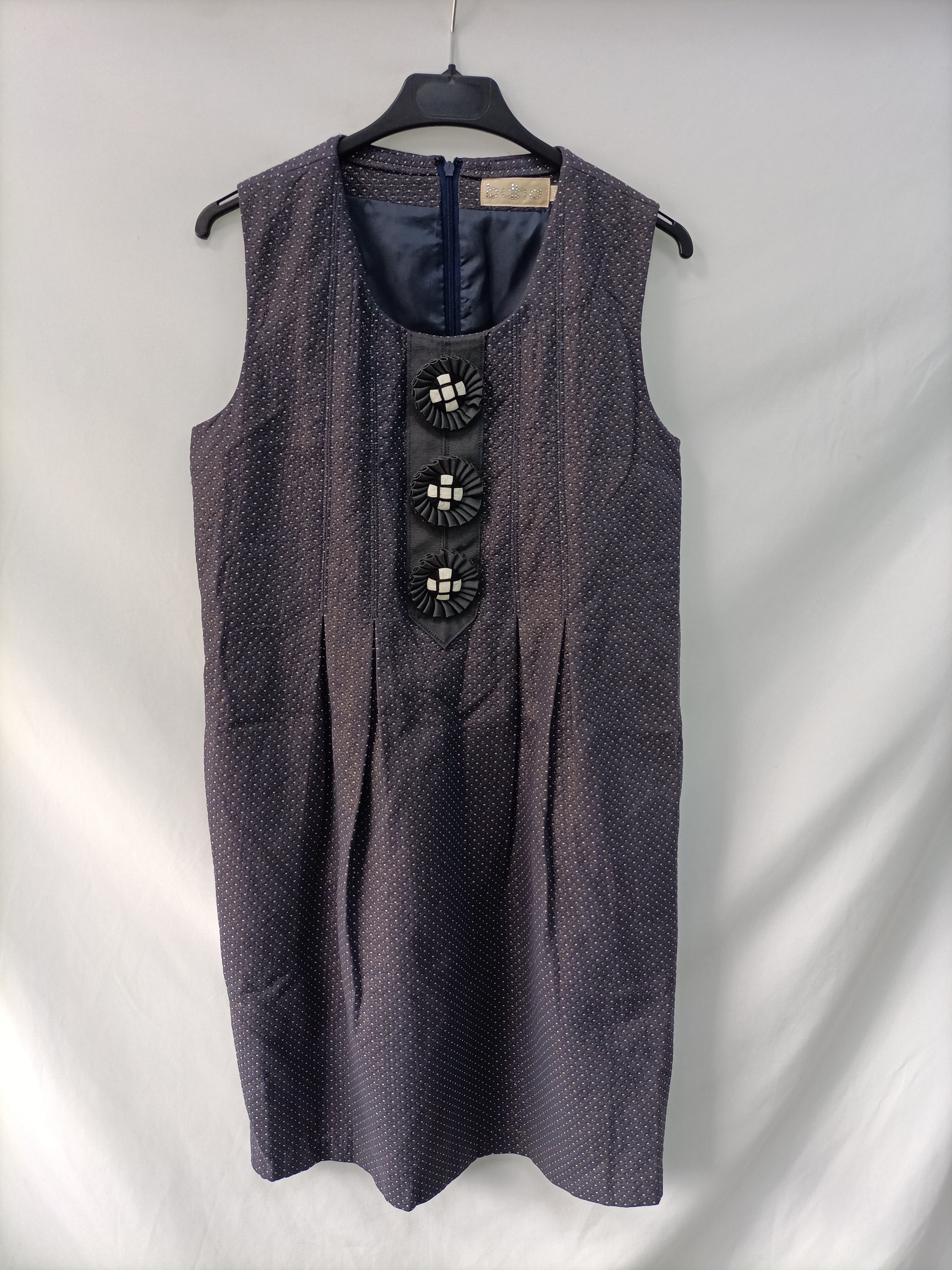 BDBA. Vestido midi azul de lunares blanco y purpurina dorada con flores en el escote sin mangas tiene bolsillos laterales y se abrocha con cremallera largo 93 ancho 44