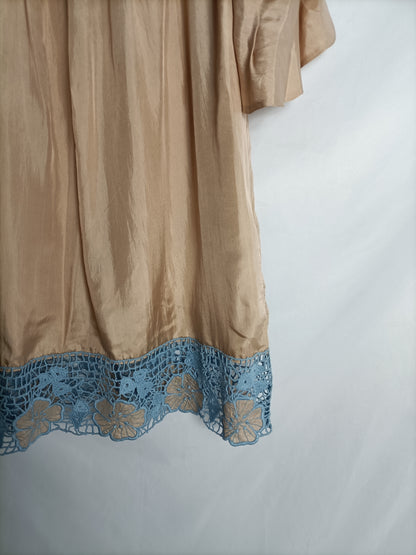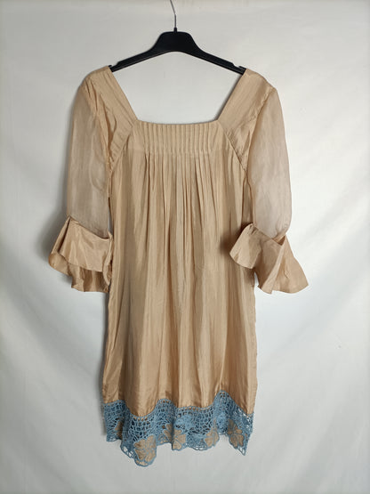 BDBA. Vestido beige satinado detalle croché azul. T S