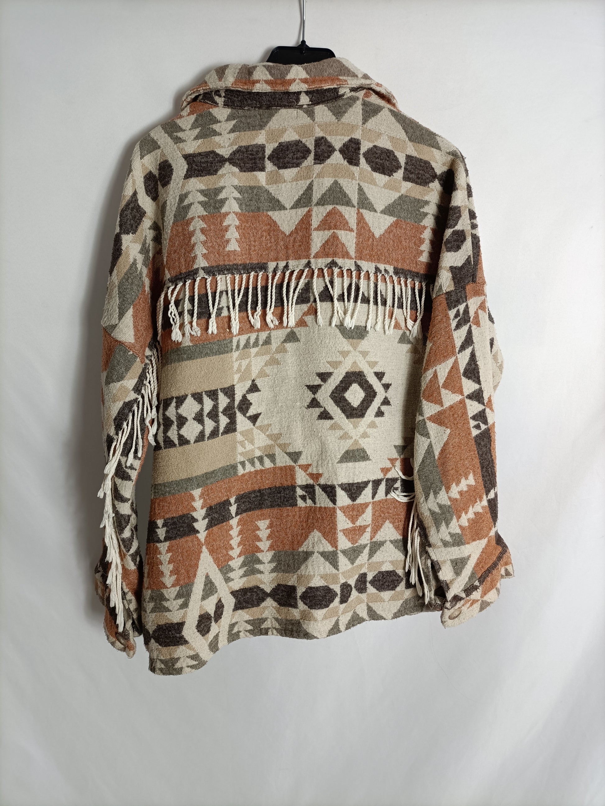 chaqueta con estampado étnico en tonos tierra con flecos.