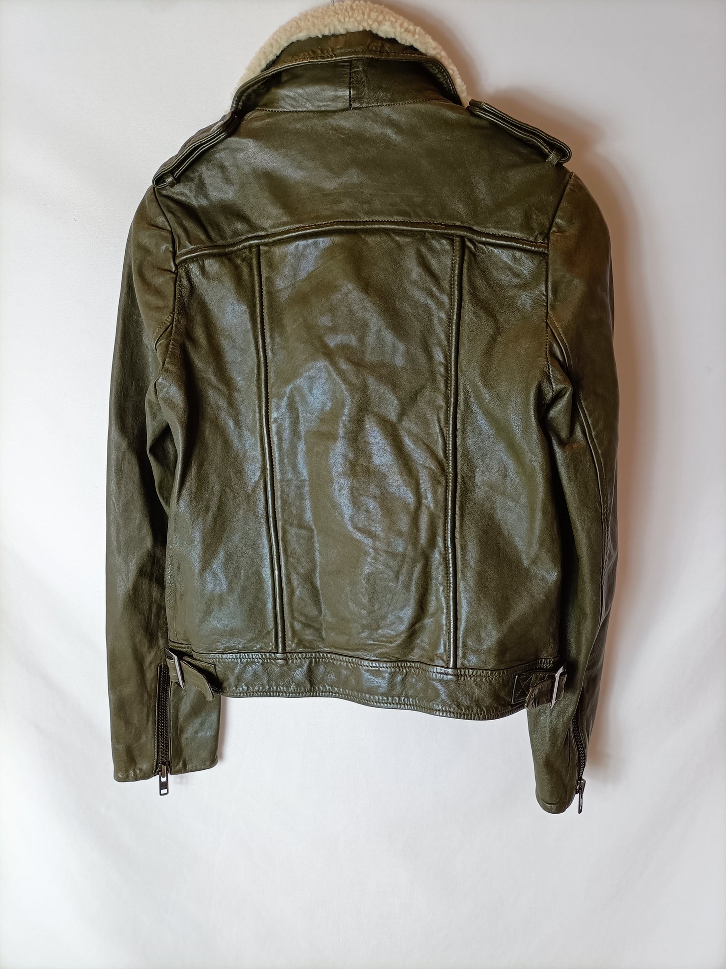 Chaqueta 100% piel verde oscuro. El cuello de borrego es extraible