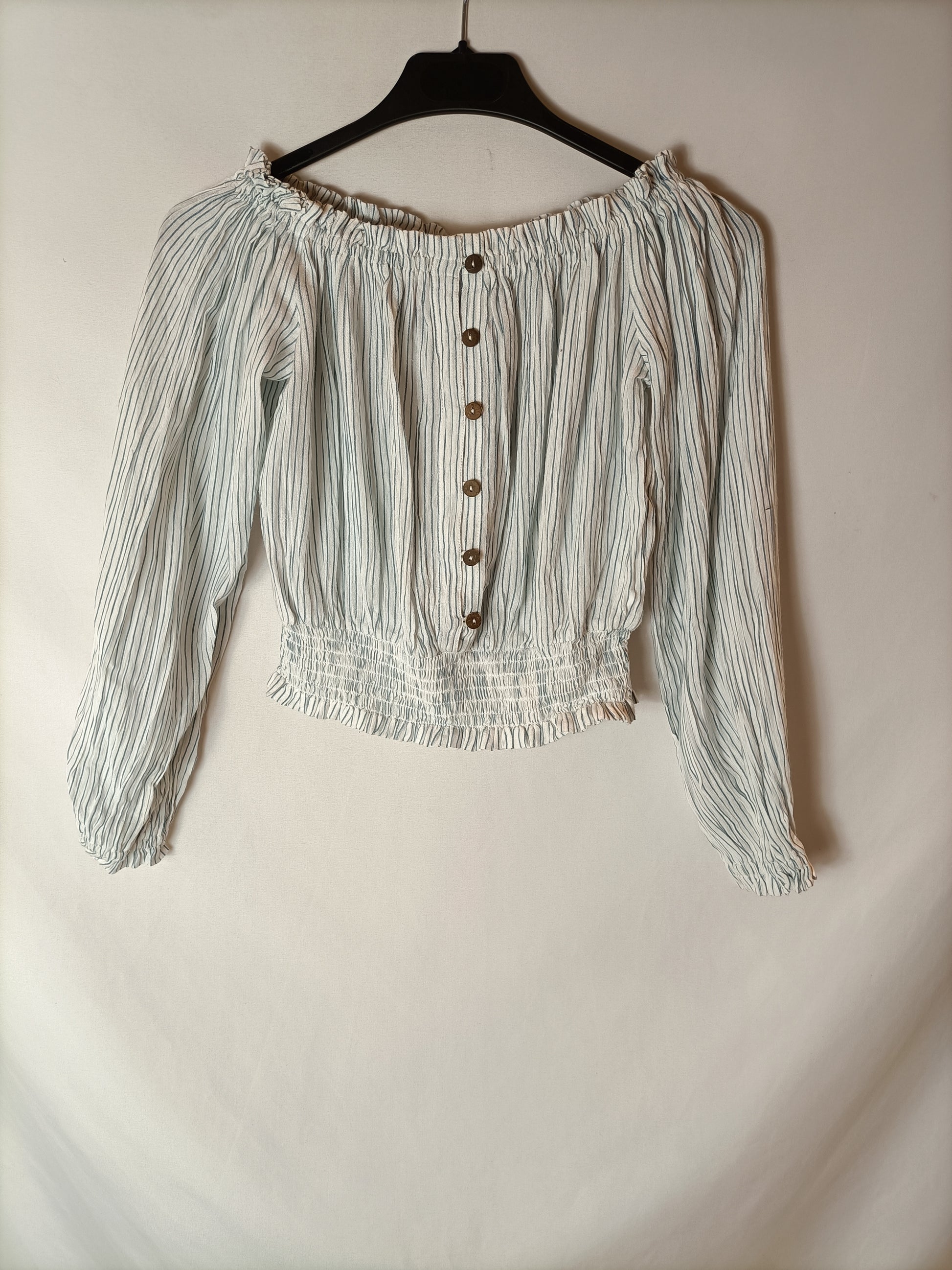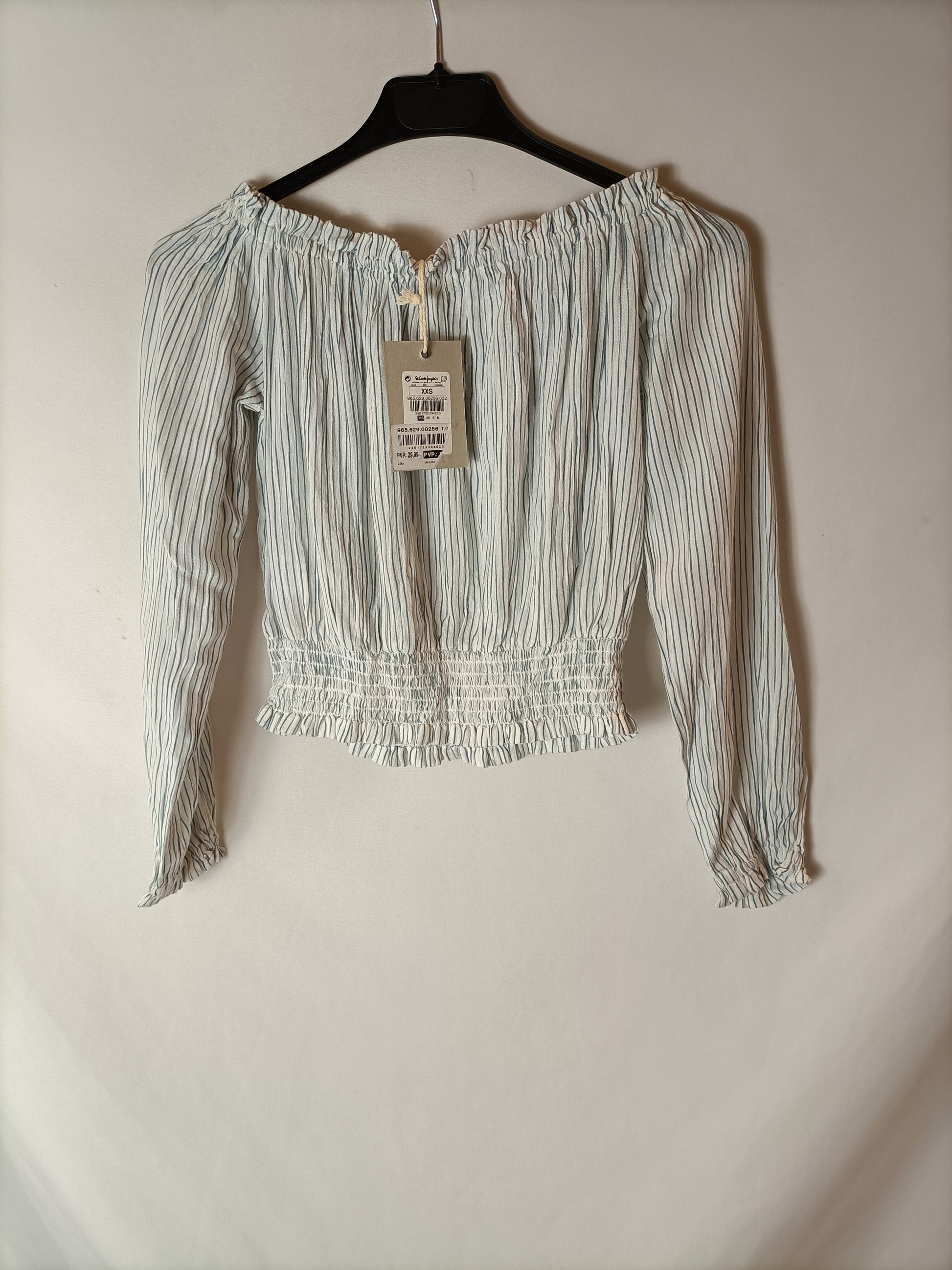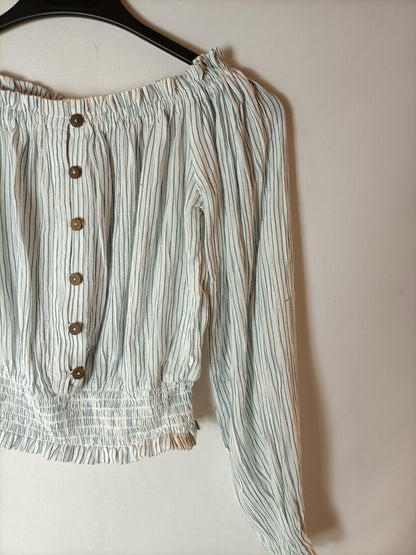 NUEVO CON ETIQUETA. top blanco con rayas azules con cuello barco y elástico en la parte de abajo y escote.