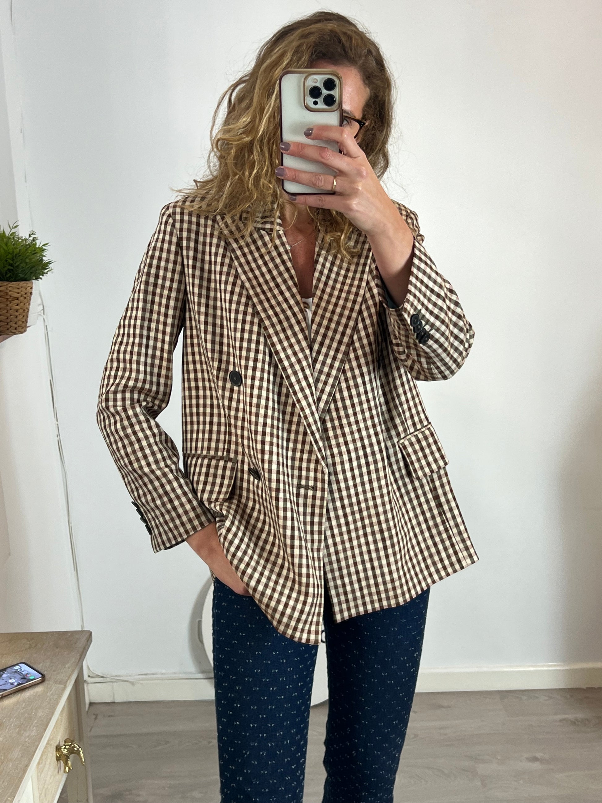 blazer oversized de cuadros en tonos tierra. Hombros 42cm, de sisa a sisa 50cm, largo 70cm