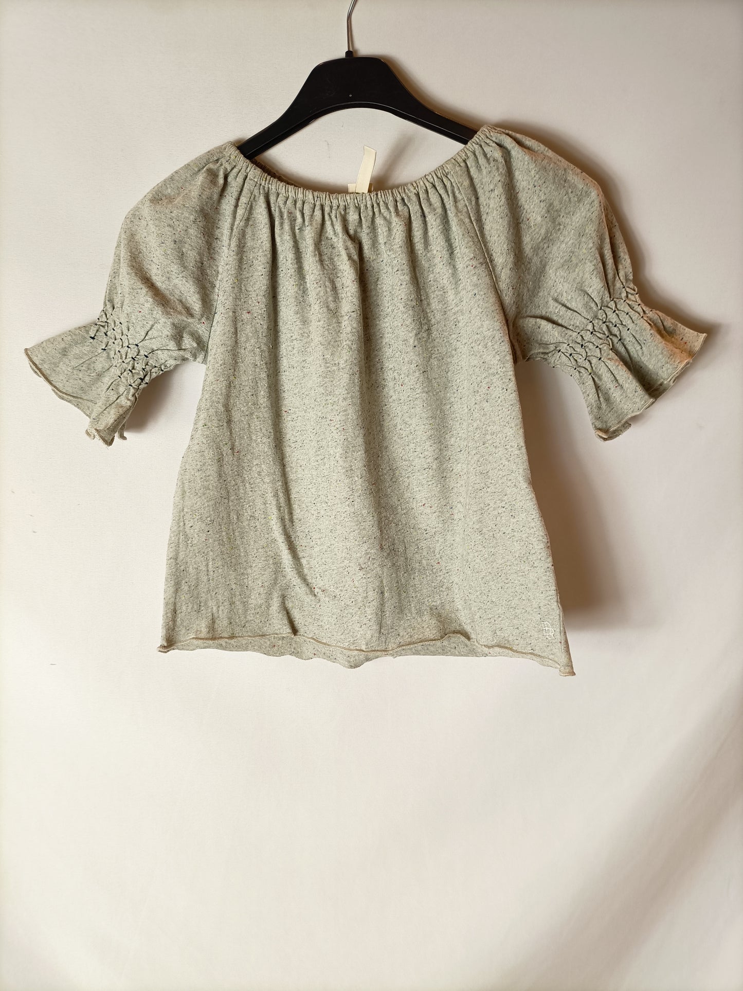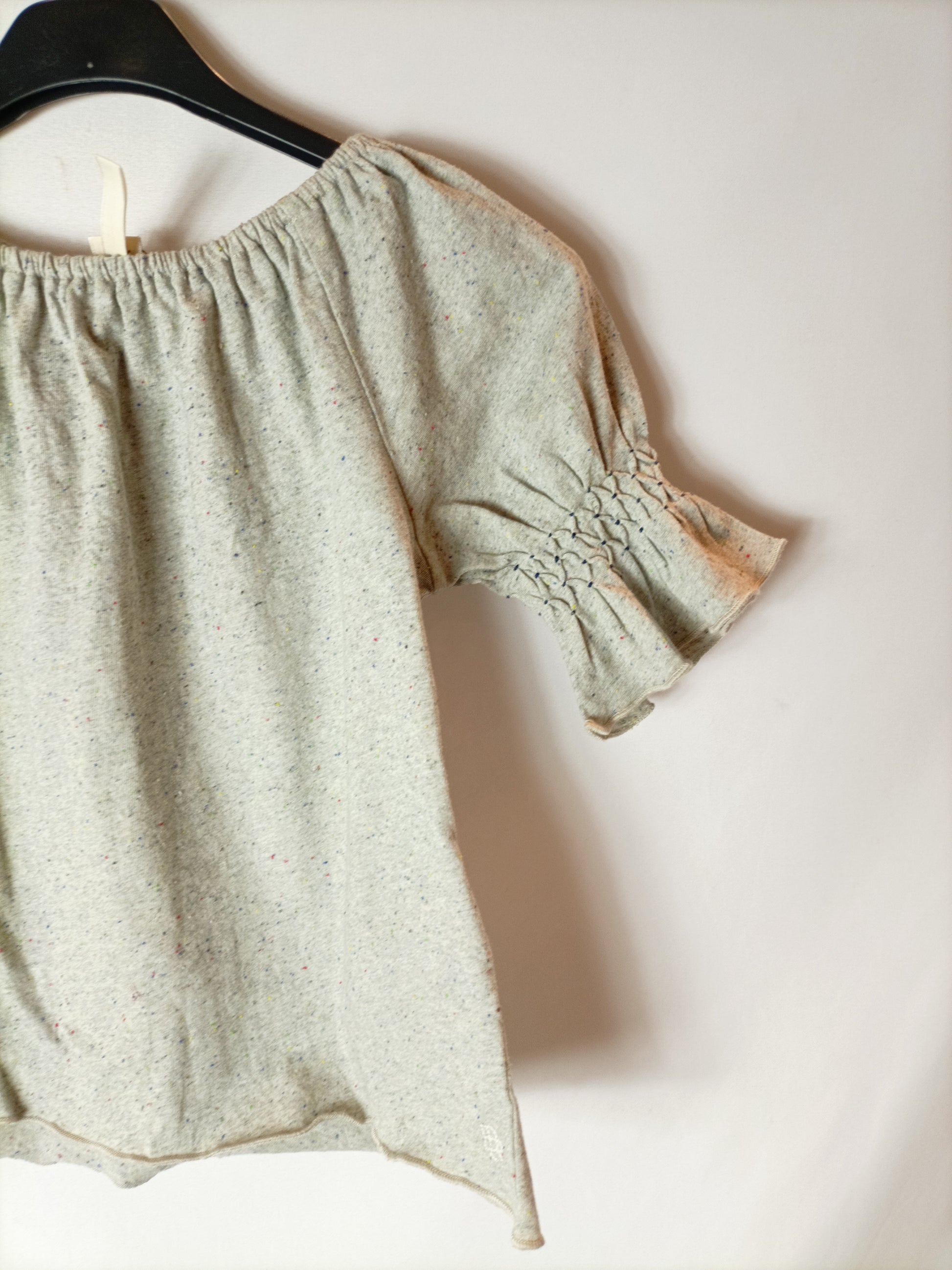 NUEVO CON ETIQUETA. Camiseta gris cuello barco con hilos de colores