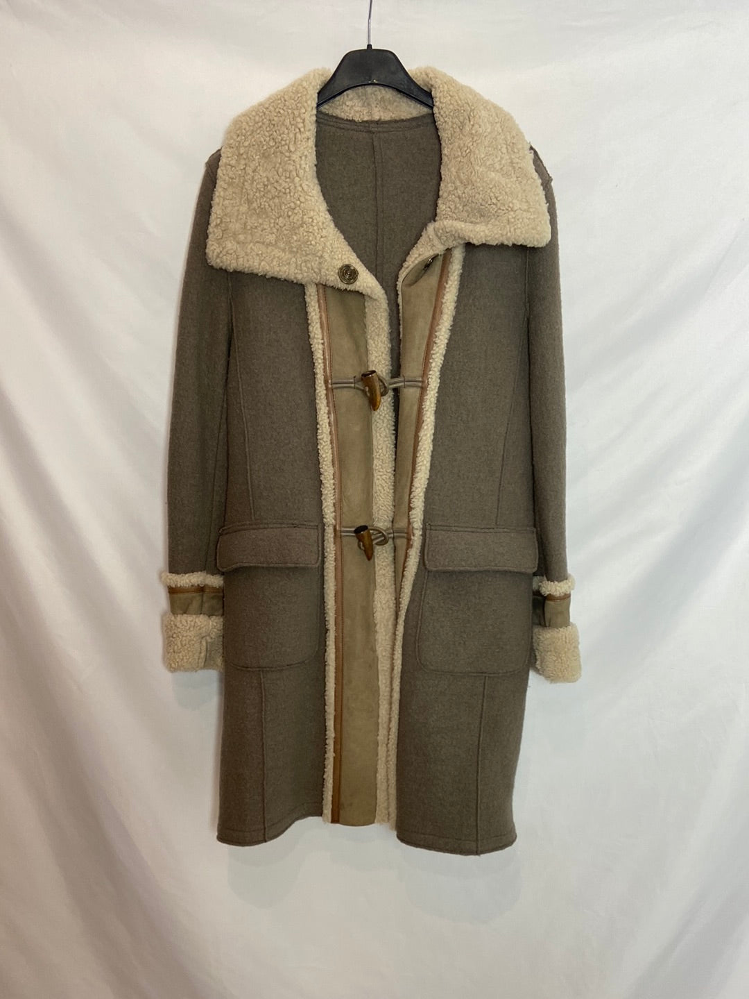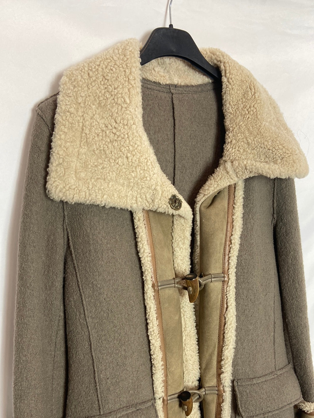 Abrigo de borrego estilo trenca con detalles de piel