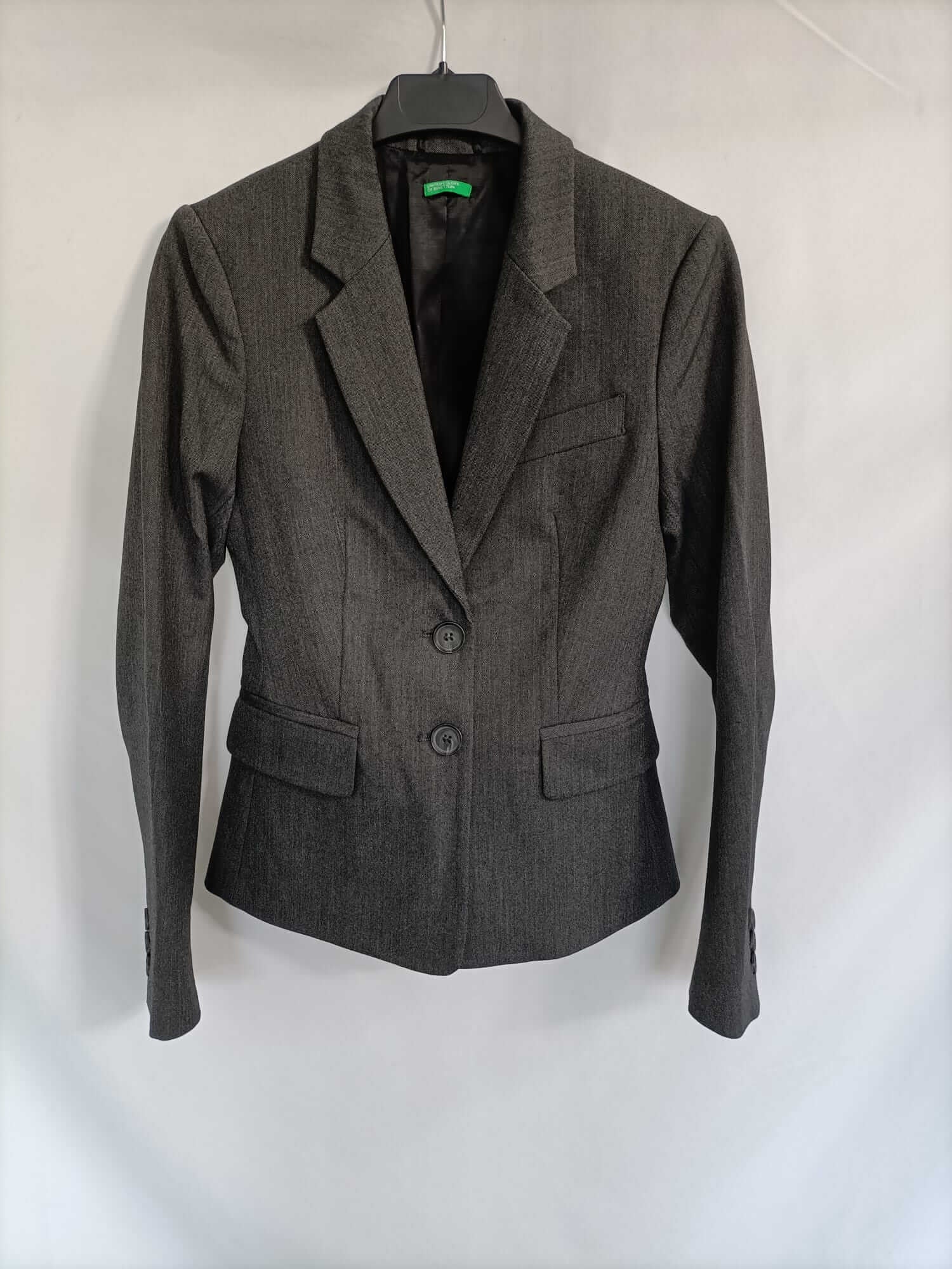Benetton. 38. Blazer gris de espiga entallada estilo de vestir. Total look. No elástica. De sisa a sisa 40 cm largo 73 cm