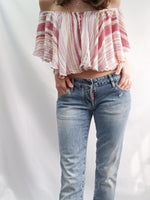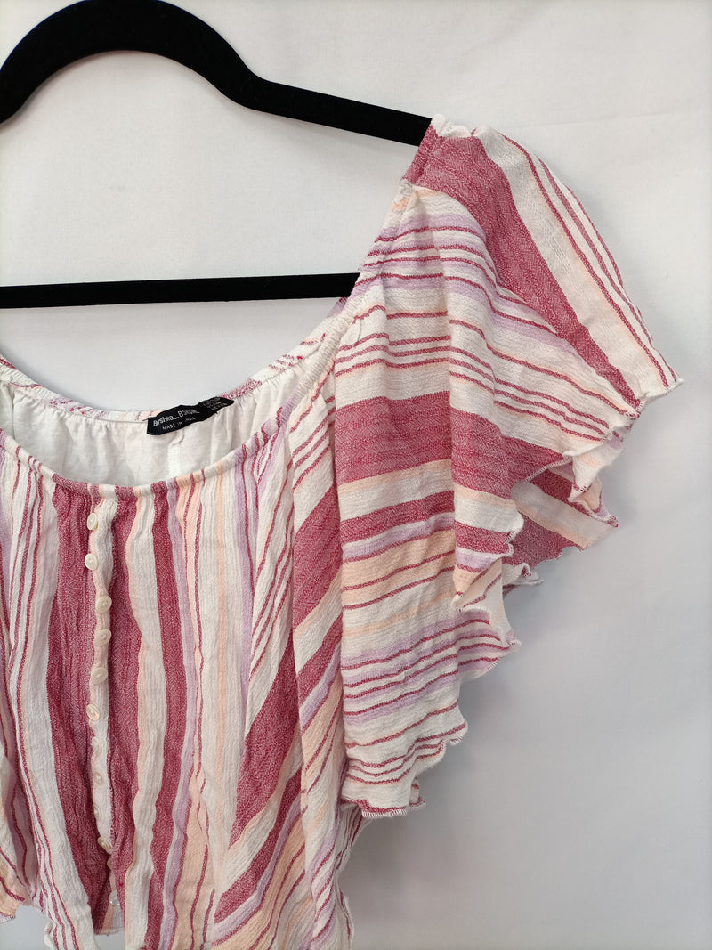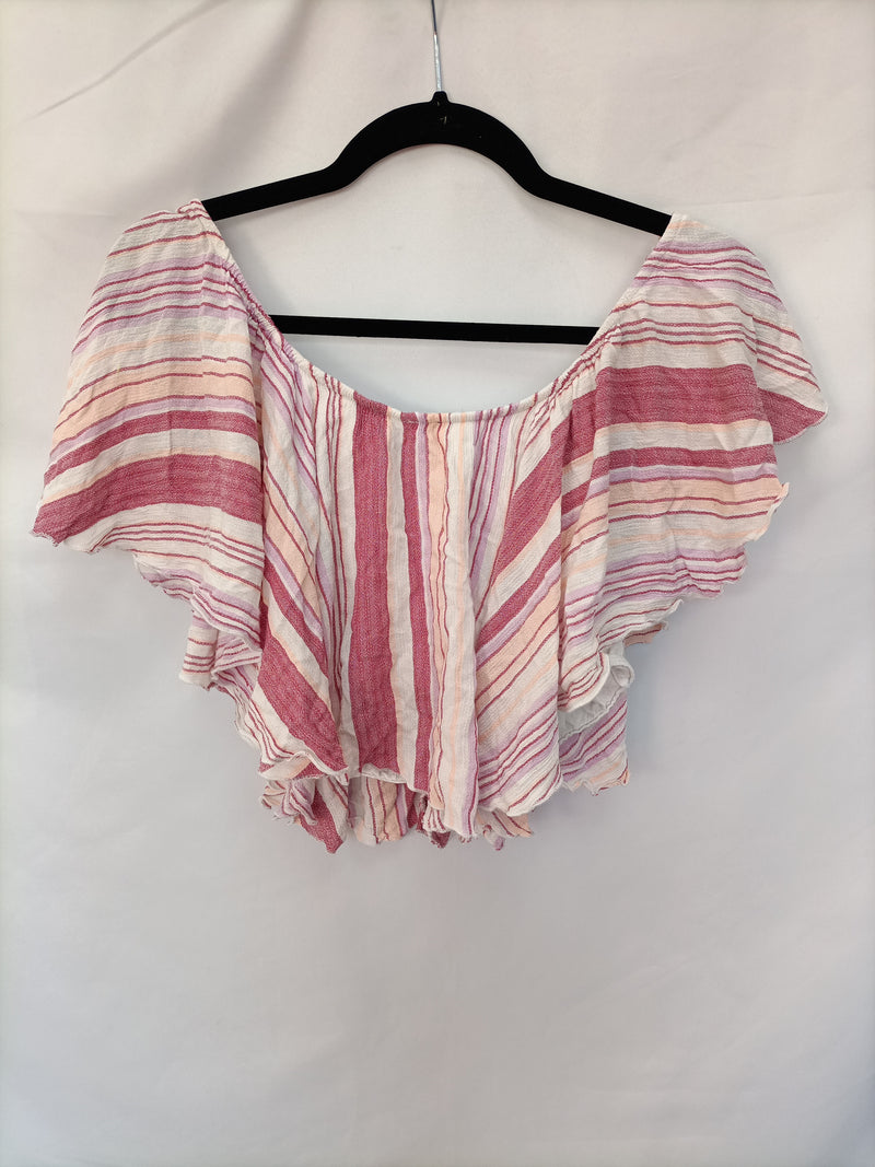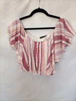 Croptop de rayas en tonos rosas. Tiene el escote elástico y vuelo.