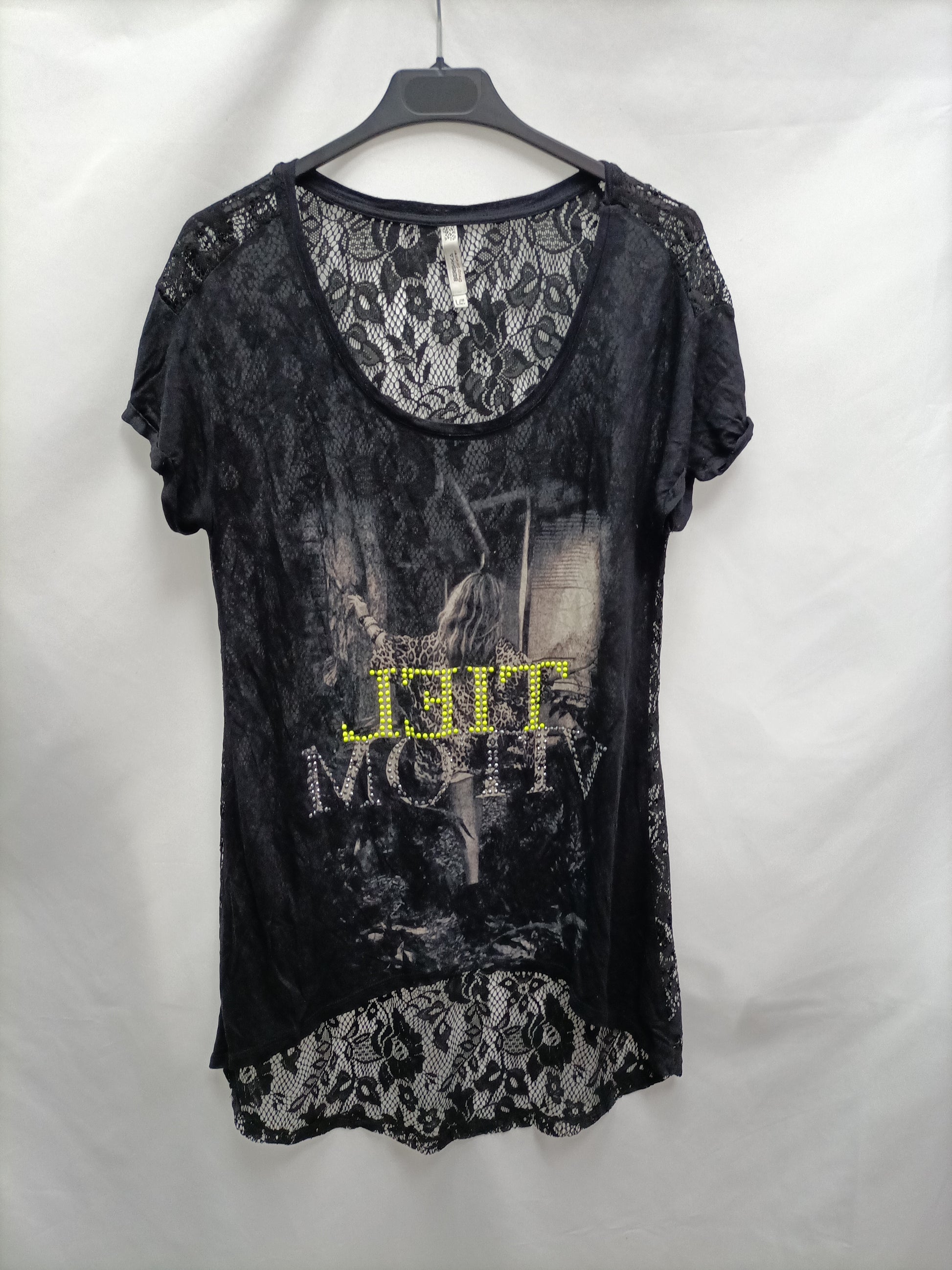 BERSHKA. Camiseta larga de manga corta negra estampada por la parte delantera y troquelada por la parte trasera largo 84 ancho 40
