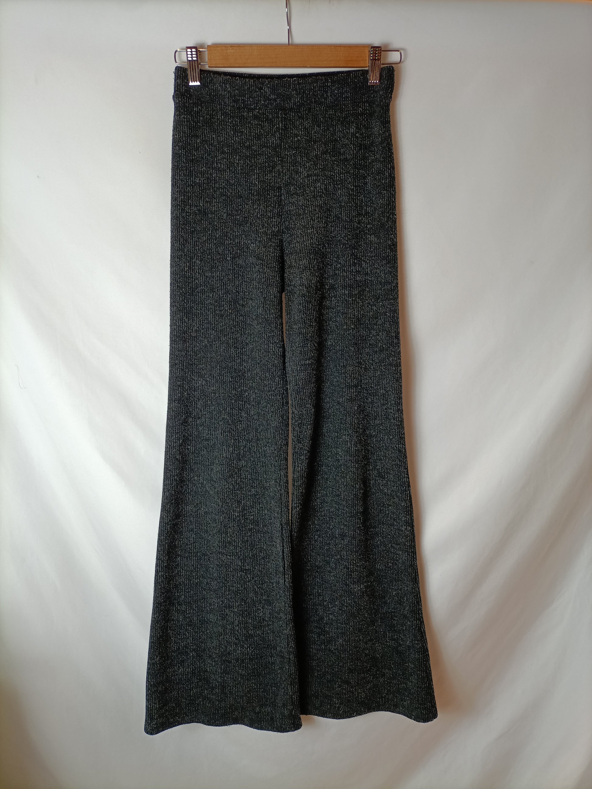 pantalón largo de punto gris jaspeado y de campana. largo 109 cm