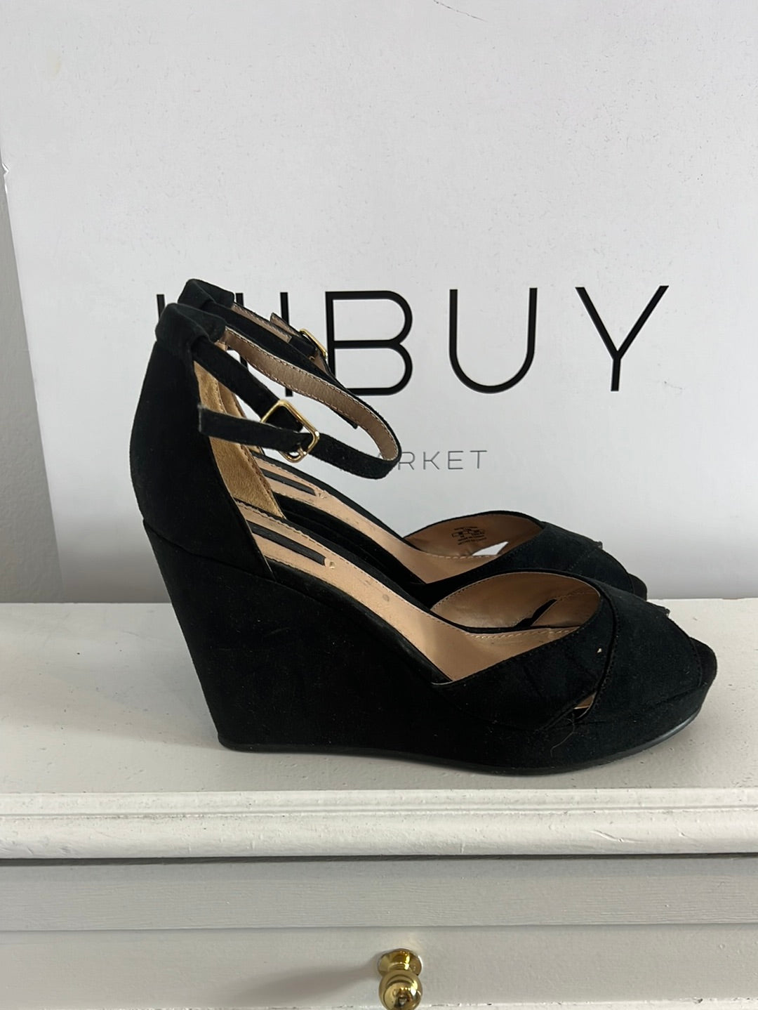 sandalias negra de antelina con tacón de cuña