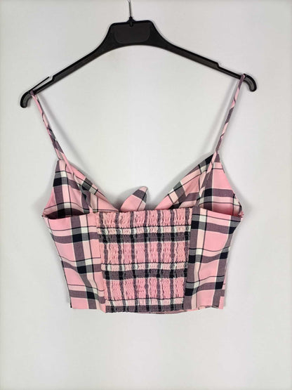 Bershka.NUEVO CON ETIQUETA. Top rosa con cuadros azules. Lazada delantera y espalda elástica. Largo 43 cm