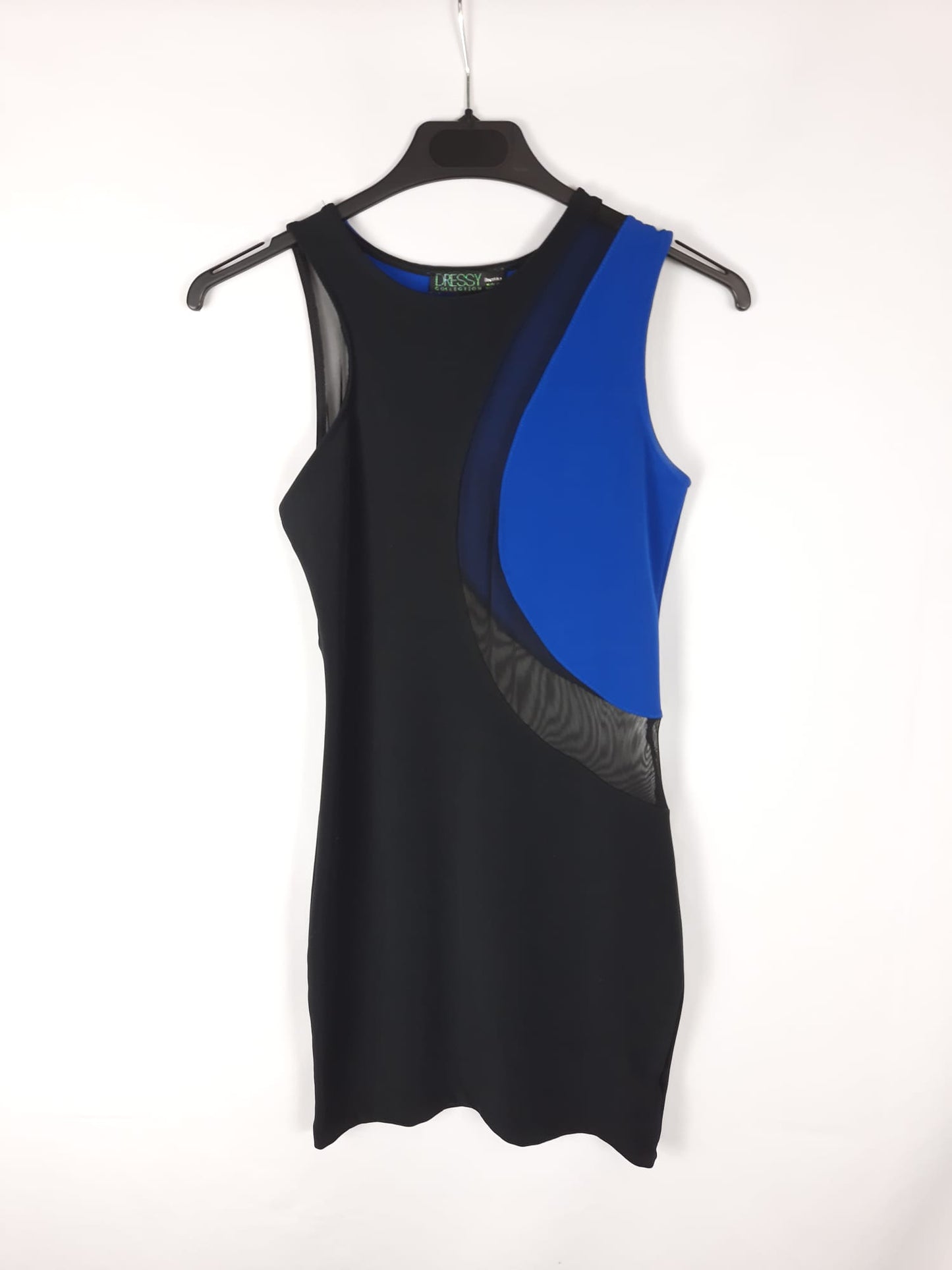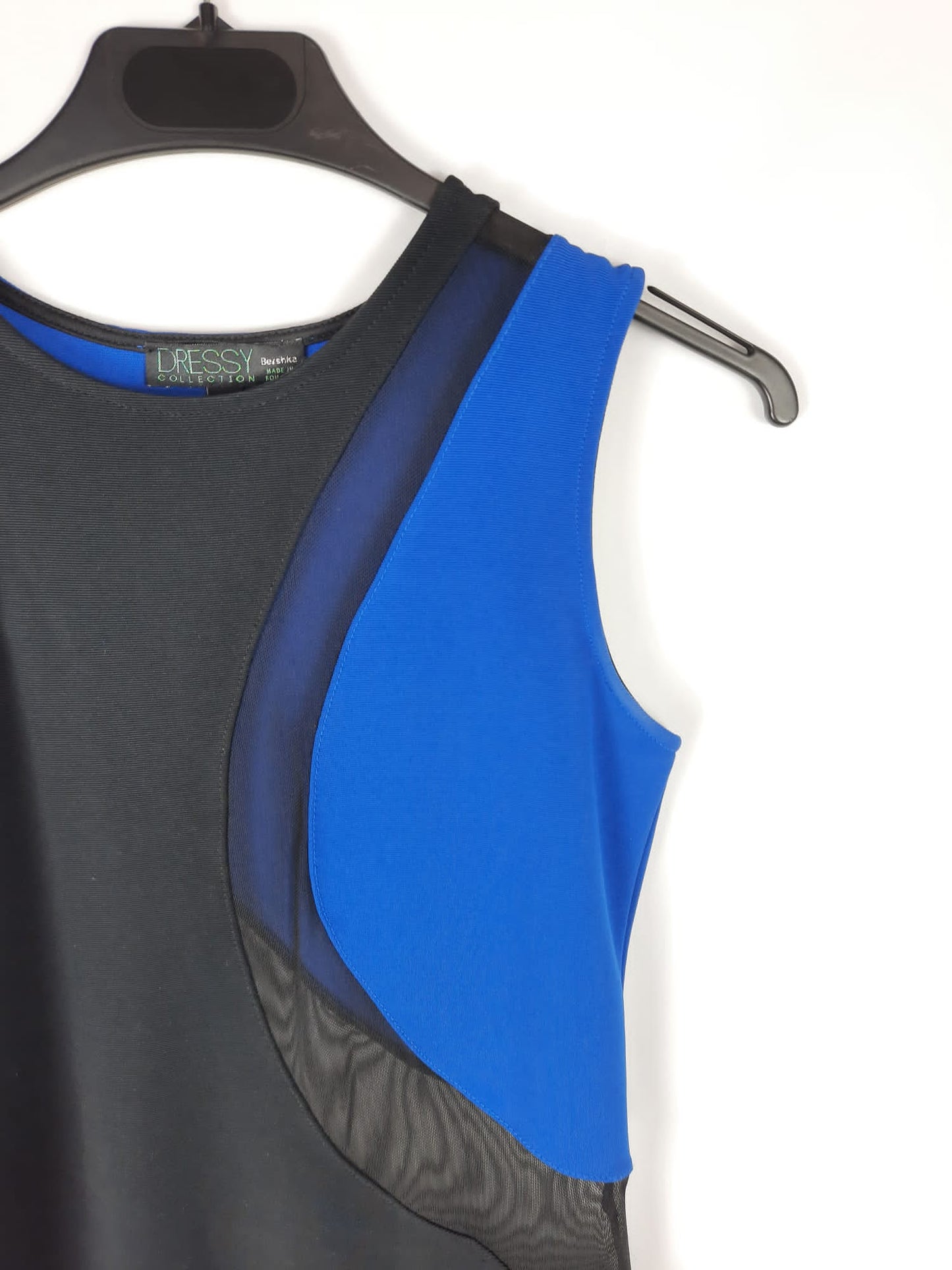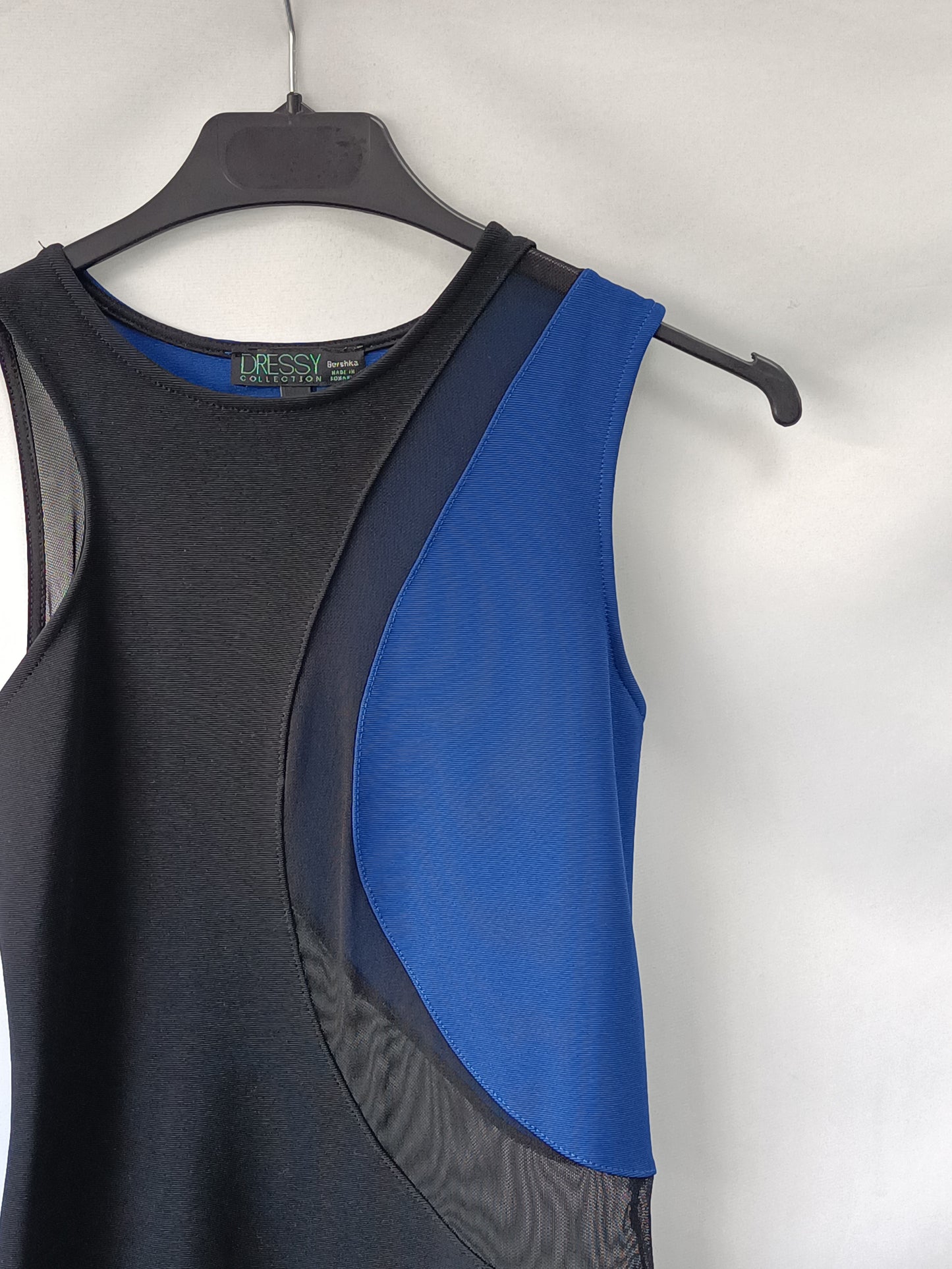 Dressy. Vestido ajustado bicolor con detalles dentull semitransparente. Elástico. Largo 76 cm