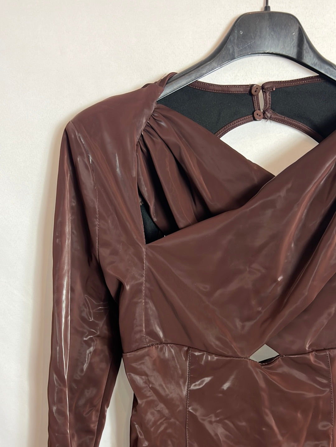 Vestido marrón elastico textura parecida a la piel . Largo 79cm, hombreras mini