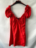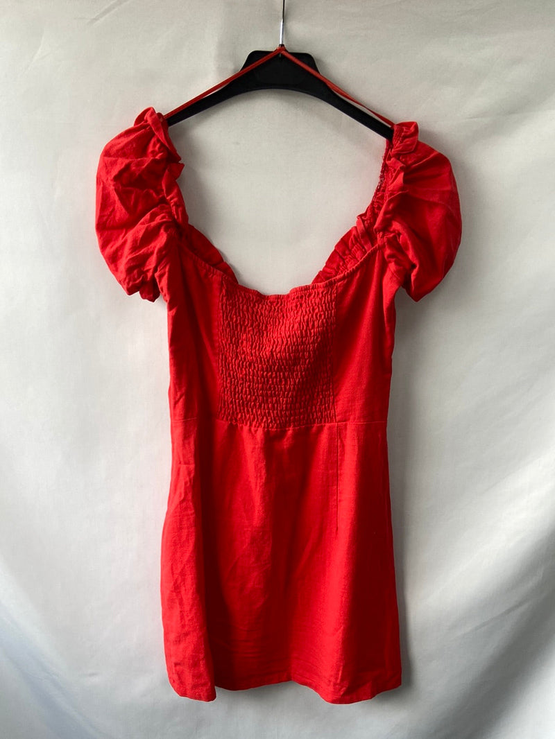 vesrido Lino rojo de Lino mangas abullonadas. No es elástico tiene cremallera lateral. La espalda si es elástica de nido de abeja. Largo 77 Cm .