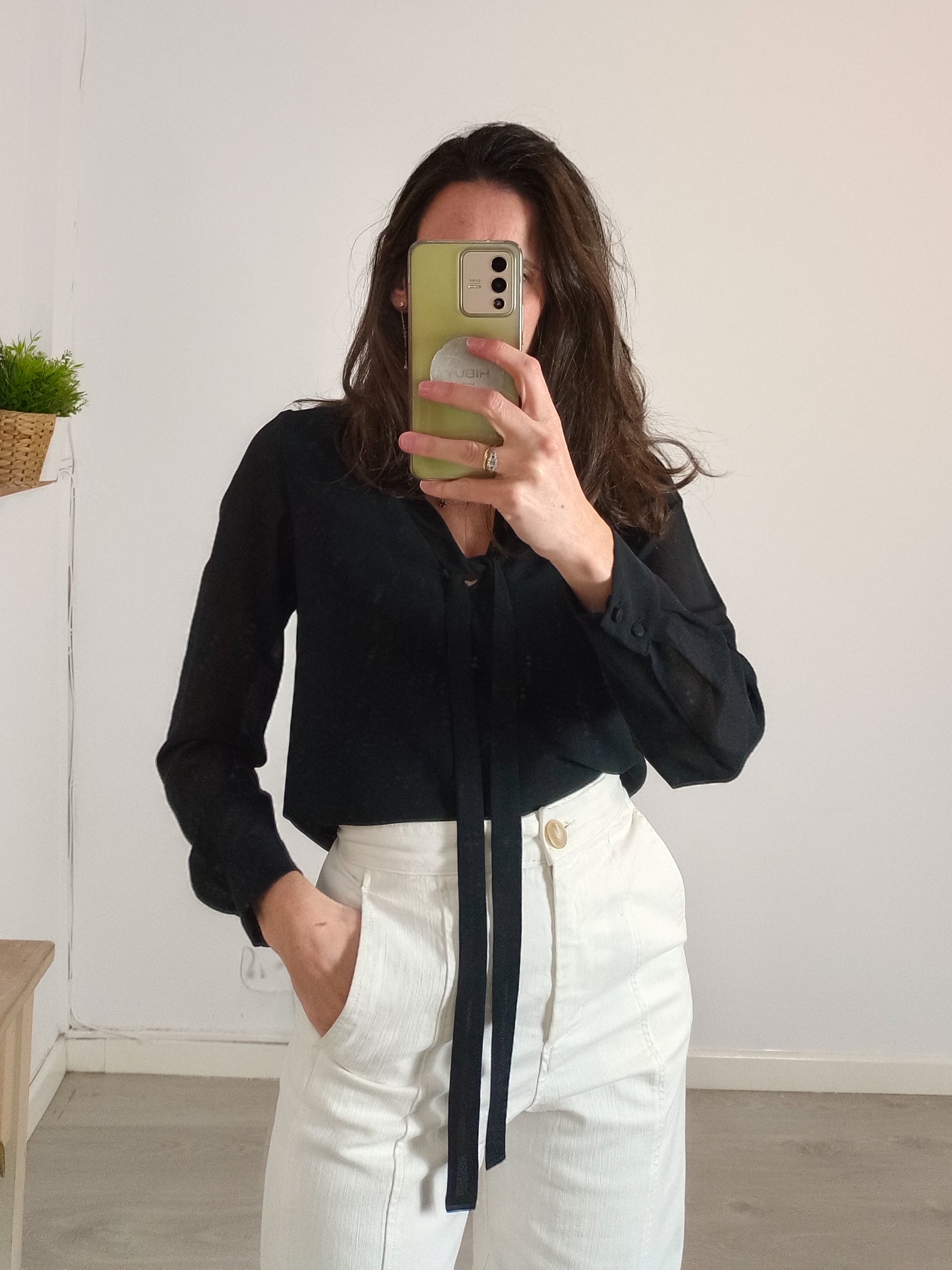 . Blusa negra botella lazada delantera. hombros 36cm, largo 54cm