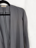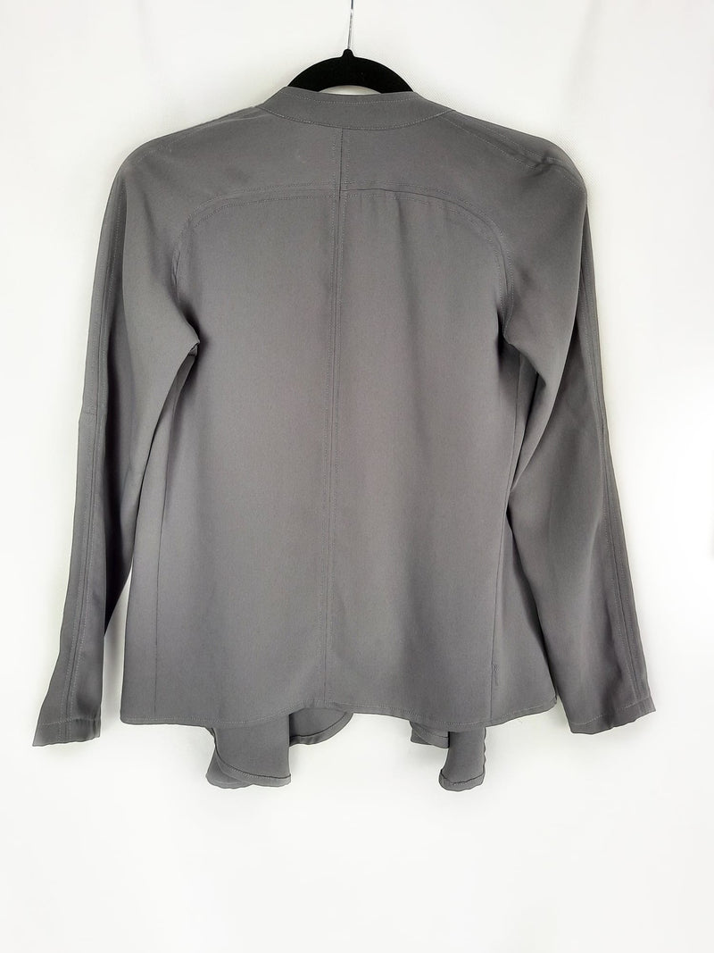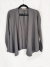 Chaqueta fluida gris oscuro acaba en picos. No se abrocha y no es elástica. De sisa a sisa 47 cm largo 65 cm
