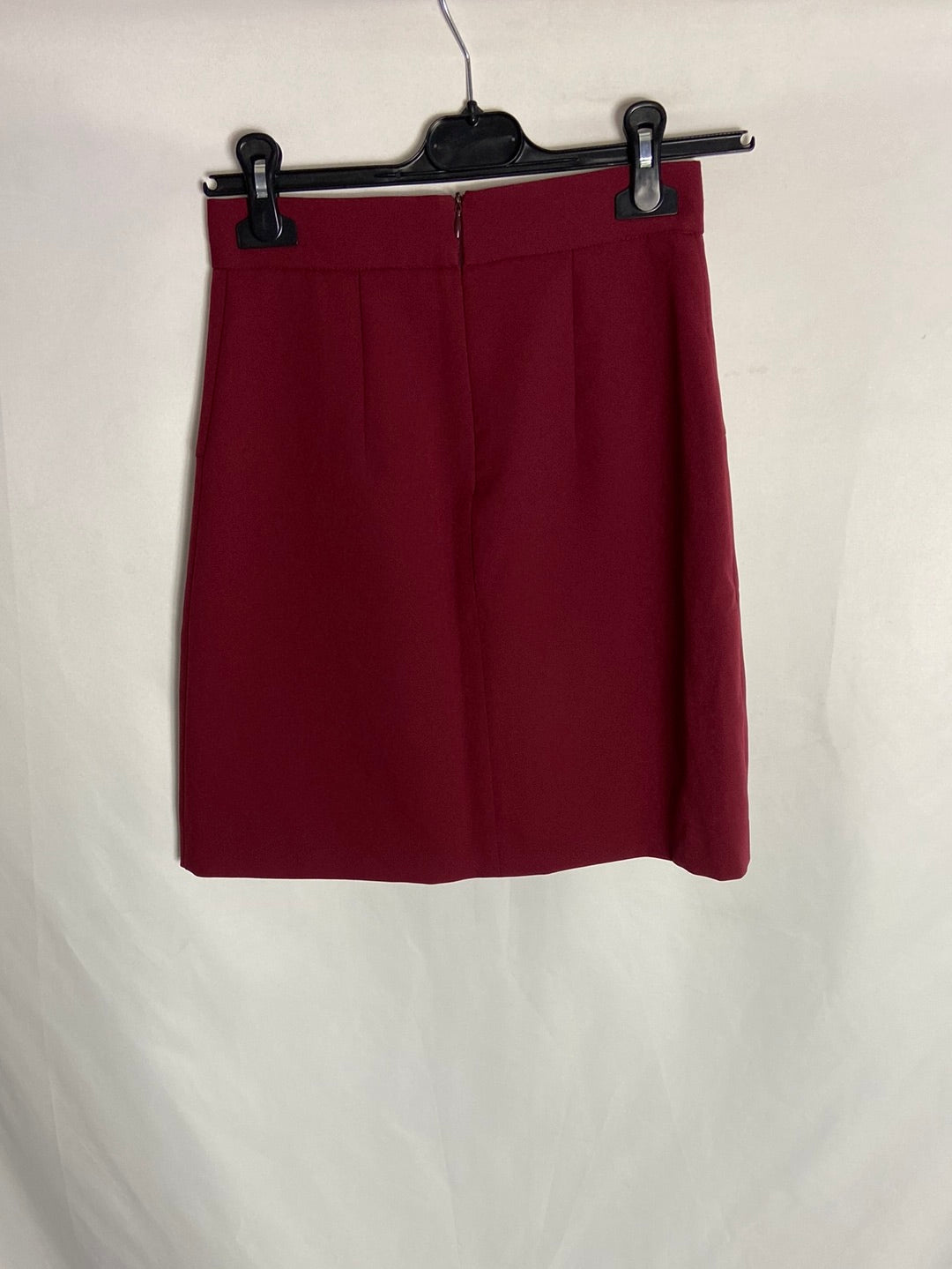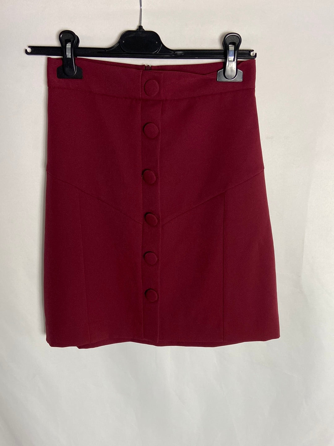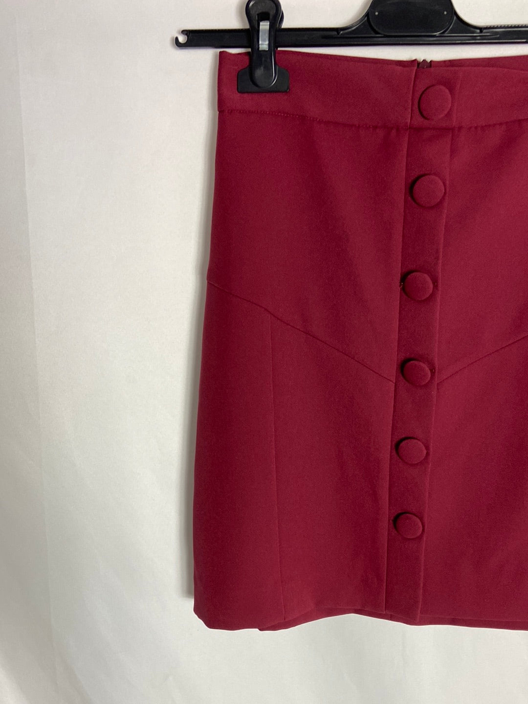falda corta burdeos con botones y cremallera trasera. cintura 32 cm largo 47 cm.