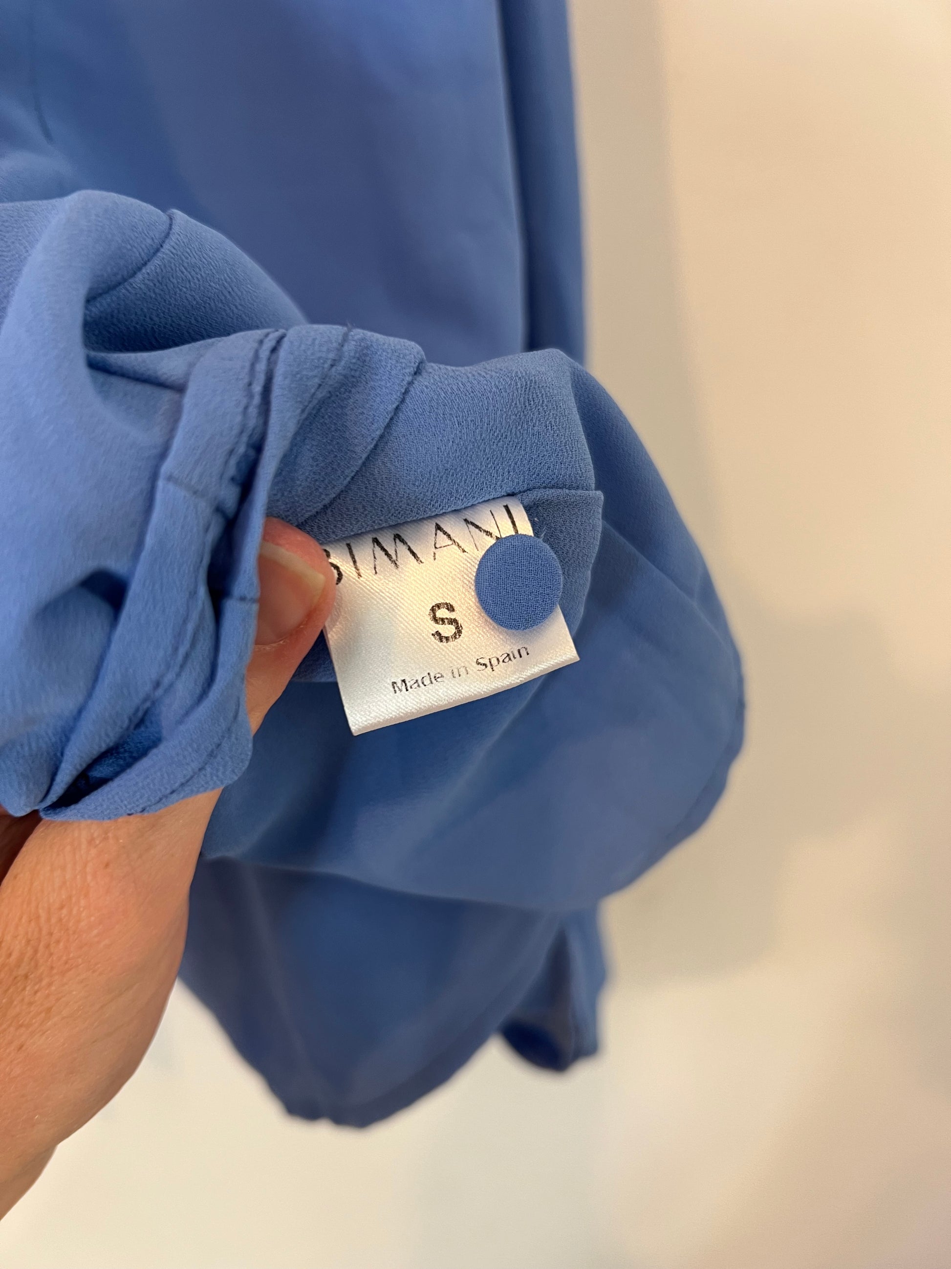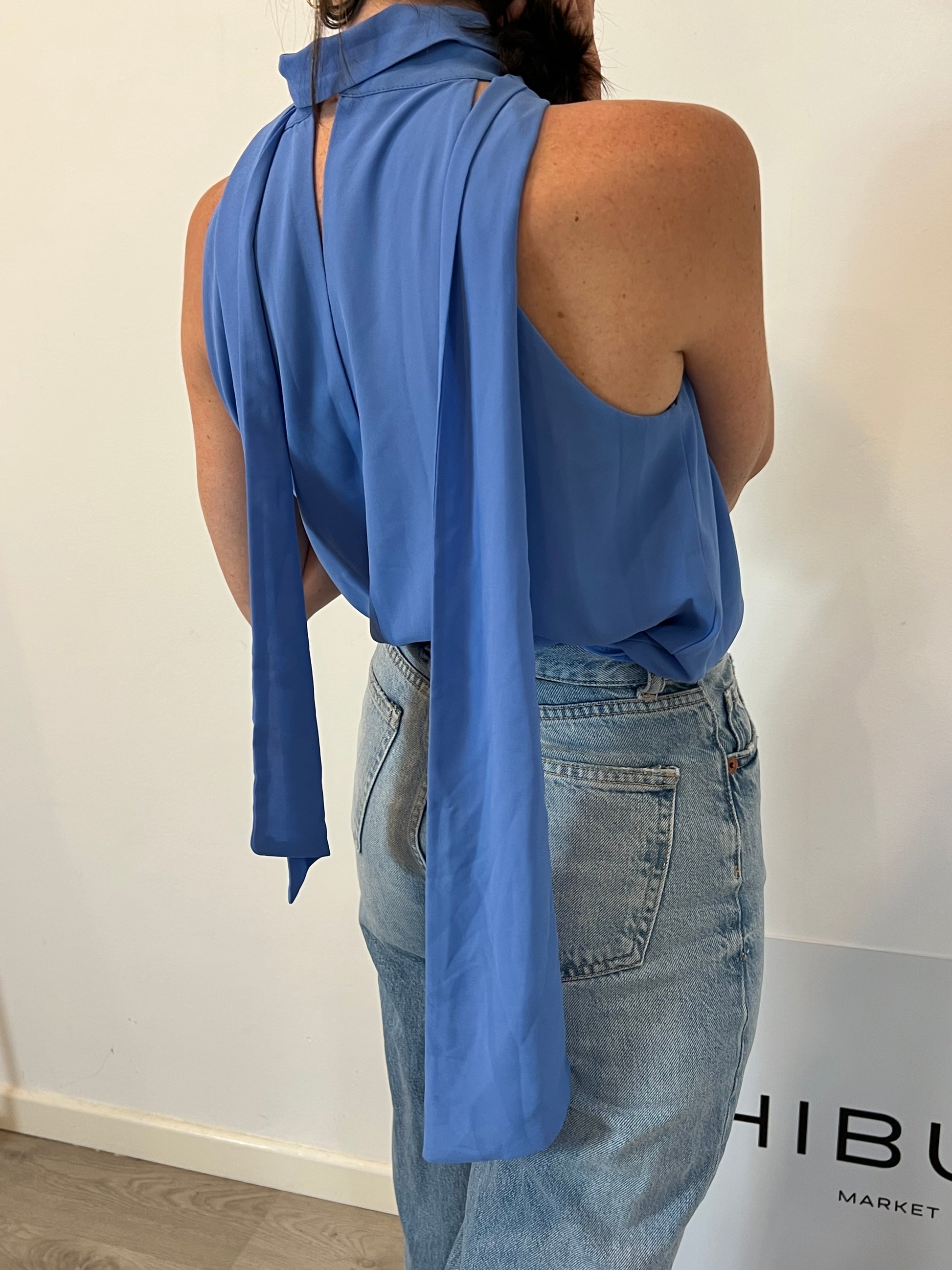 Blusa azul escote halter con lazada. de sisa a sisa 48 cm largo 52 cm