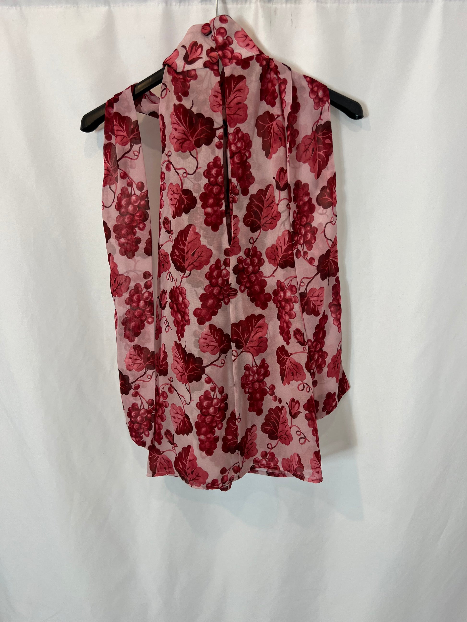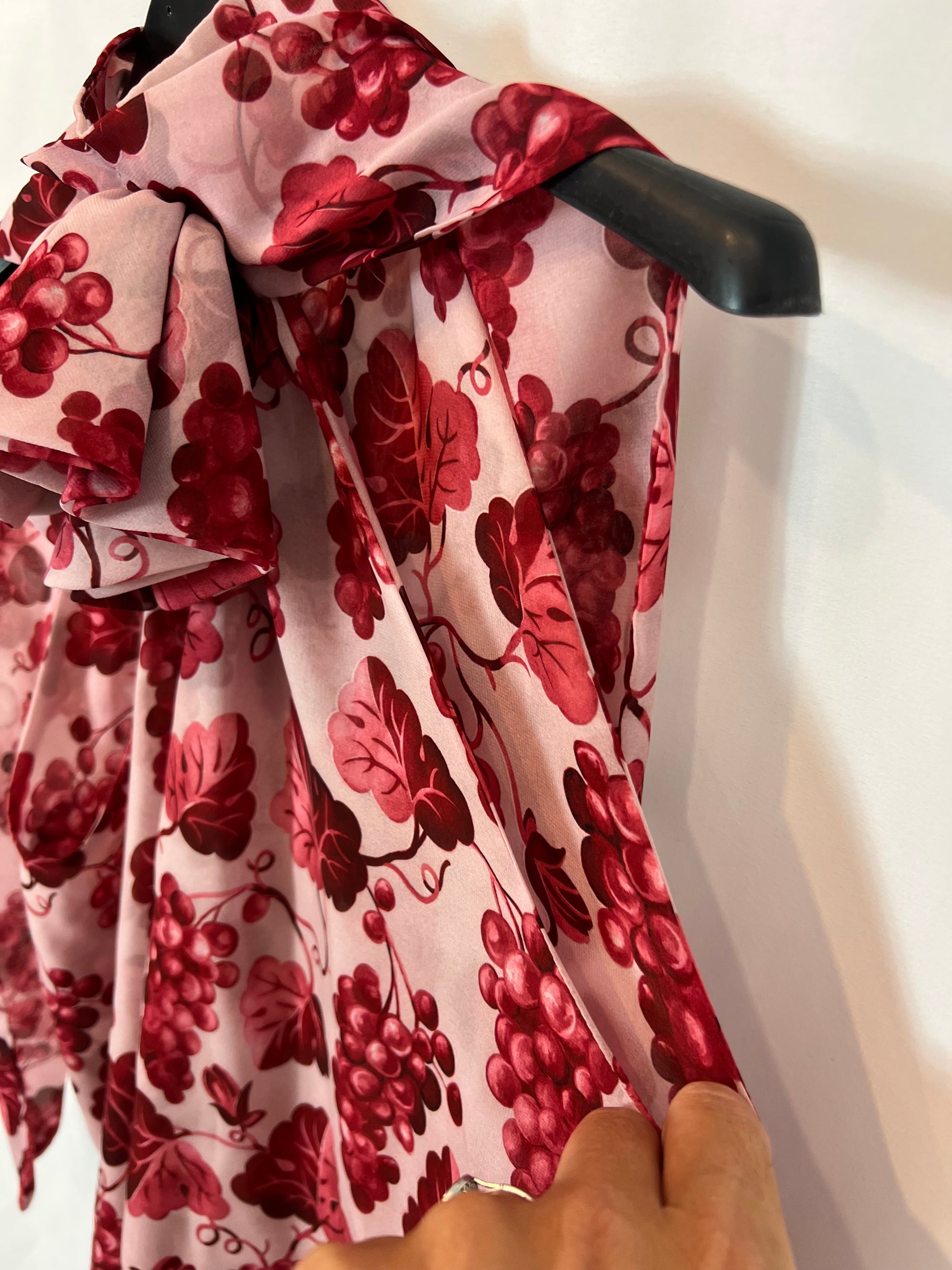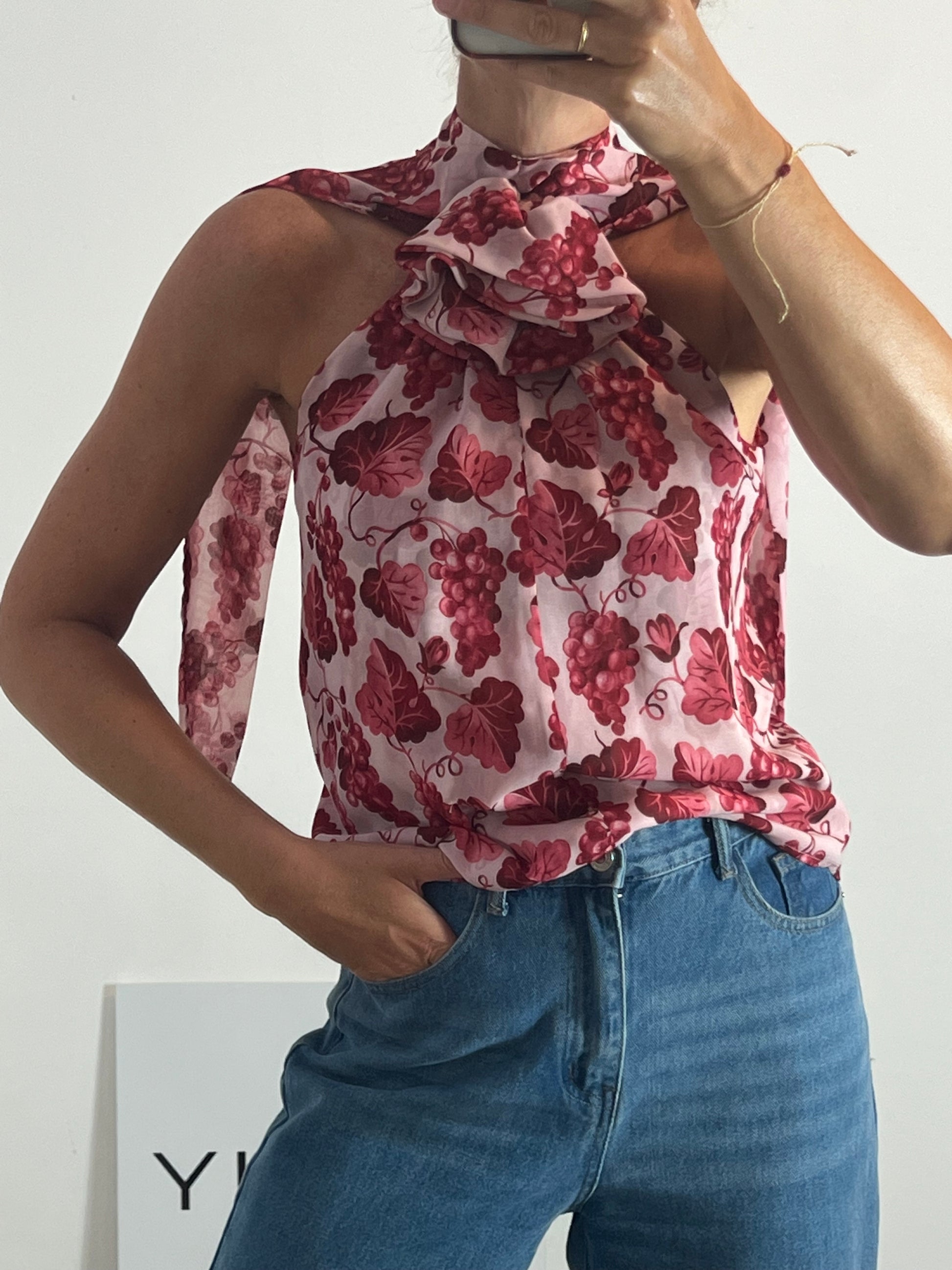 Top rosa con estampado de uvas. Colección Bimani X Juan Vidal.