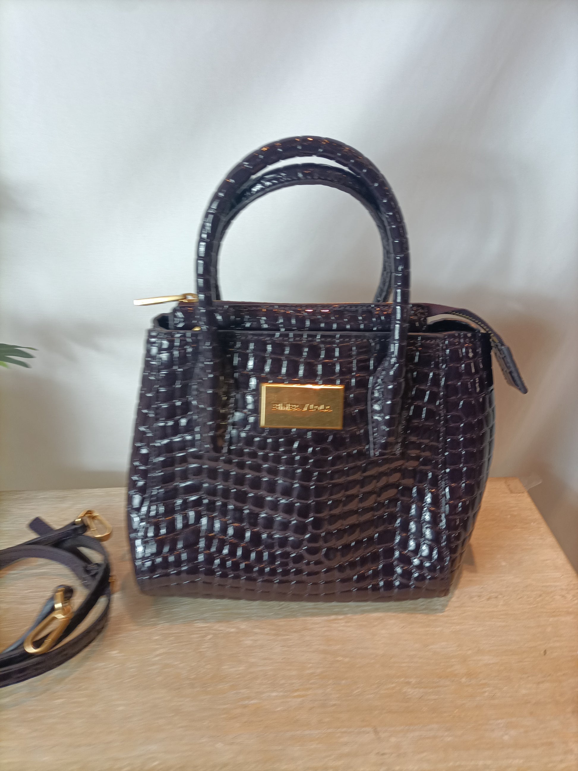 Bolso 100% piel color berenjena oscuro con cadena y letras logo en dorado