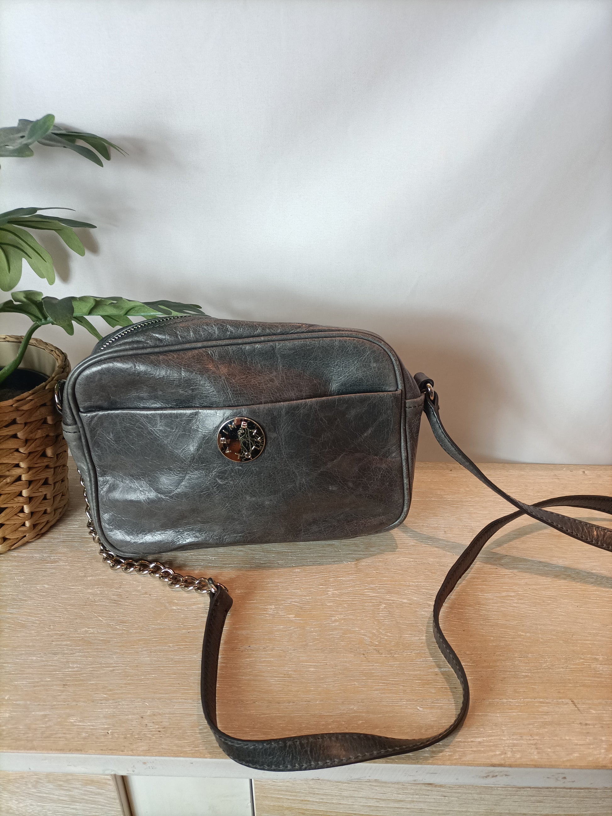Bolso 100% piel gris. Tara: pequeña mancha en la parte trasera.