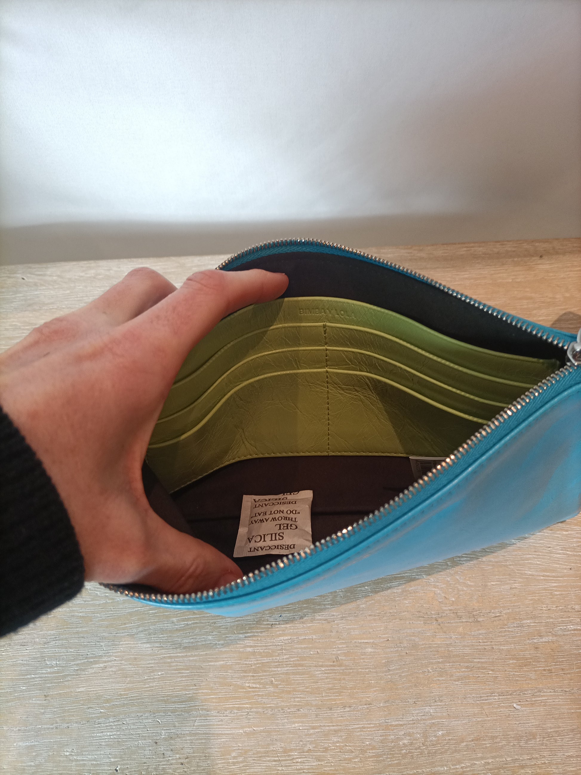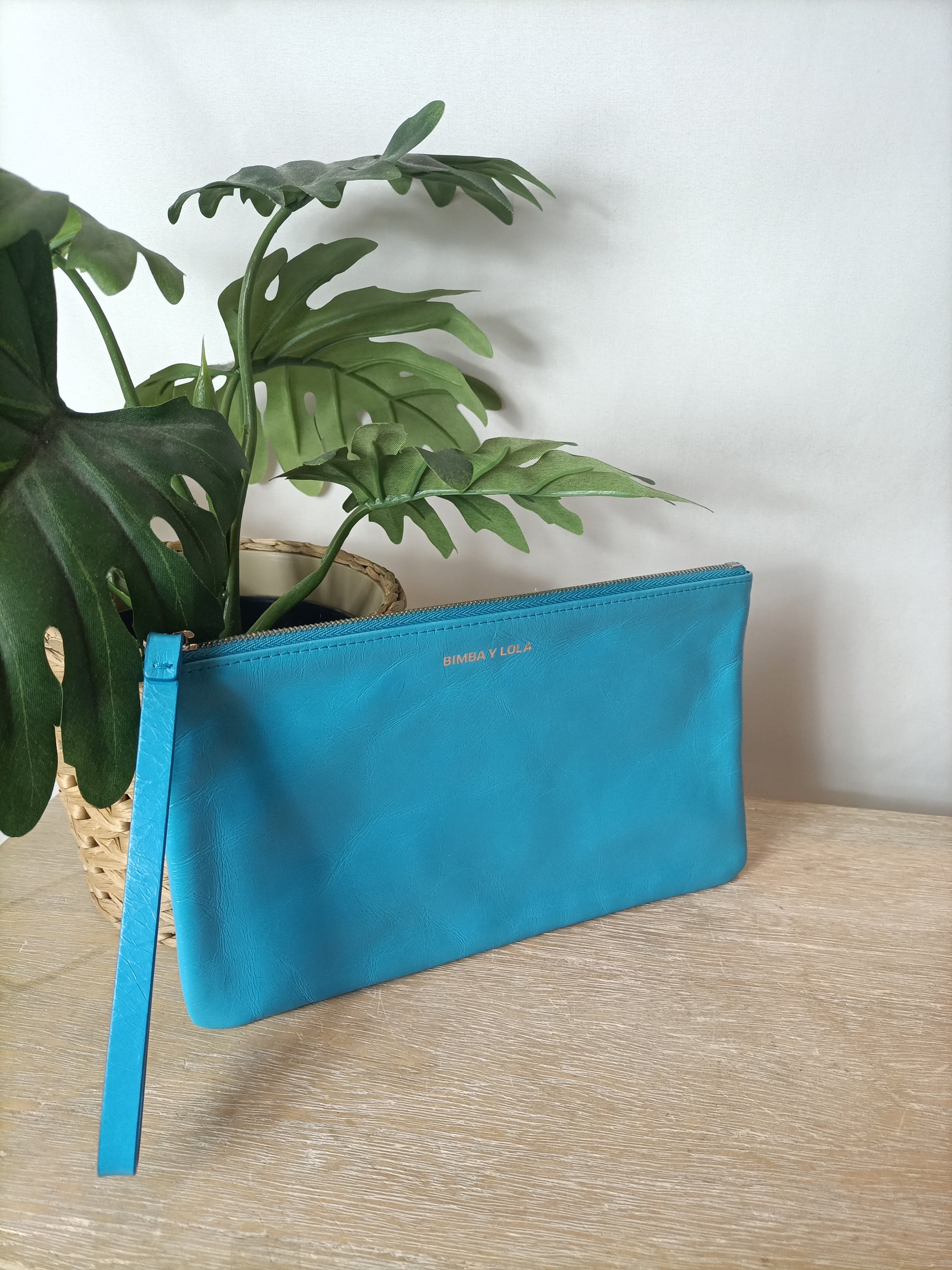 BIMBA Y LOLA. Cartera de mano turquesa. Interior con apartado para tarjetas en color verde.