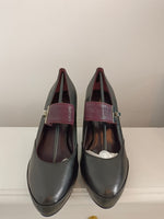SIN ESTRENAR. Zapatos tacón negro con plataforma y hebilla morada