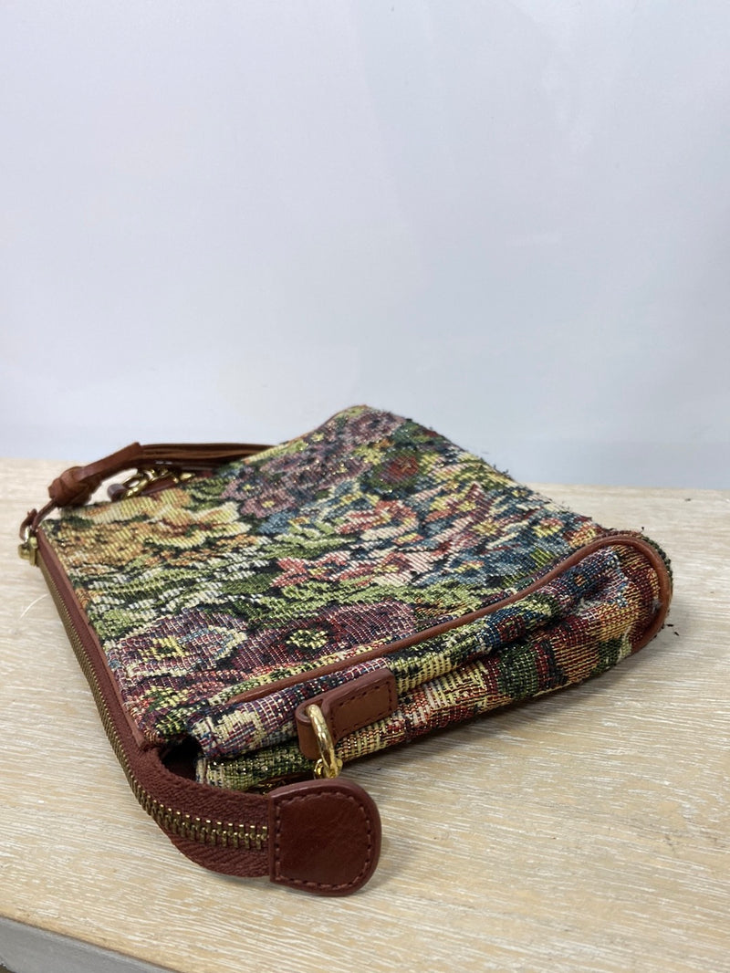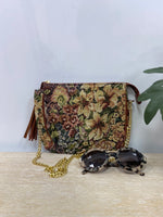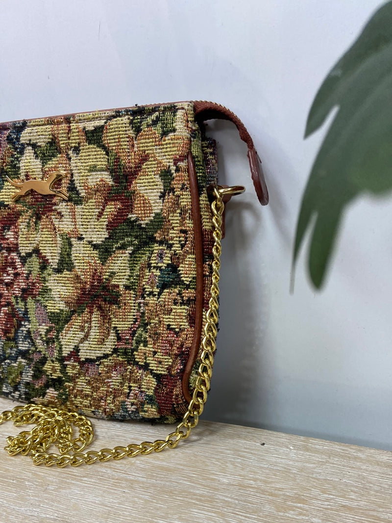 Bolso tela estampado estilo vintage. Cremallera con un compartimento interior. Cadena larga dorada. Alto 17 cm largo 21 cm y ancho 4 cm