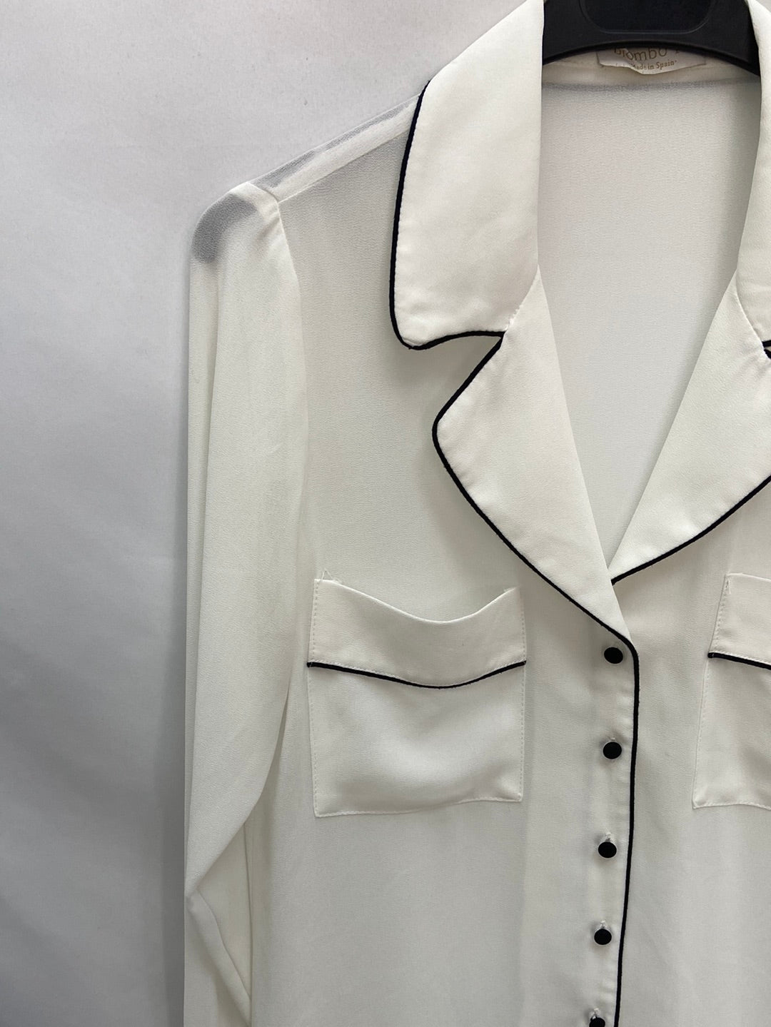 blusa blanca semitransparente estilo pijamera con detalles en negro