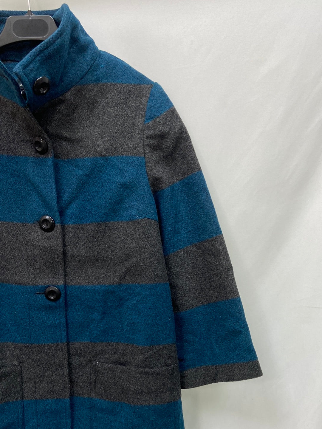 Abrigo de paño con botones gris y azul. Largo 76 cm