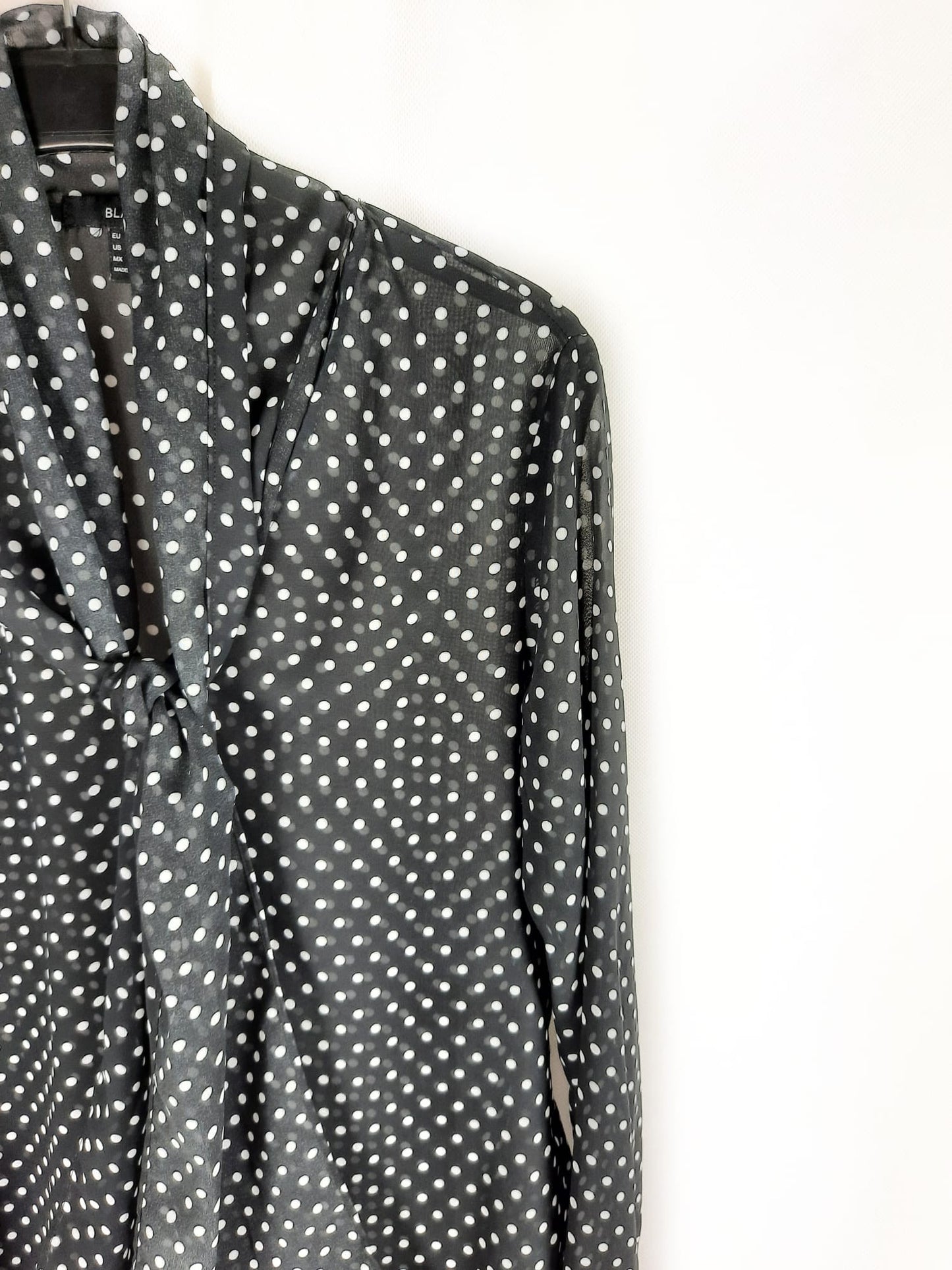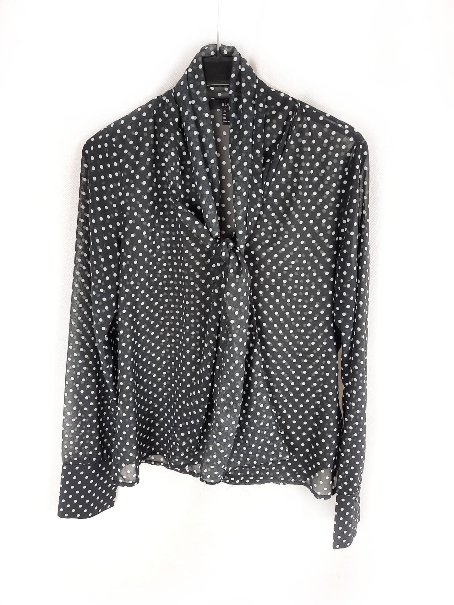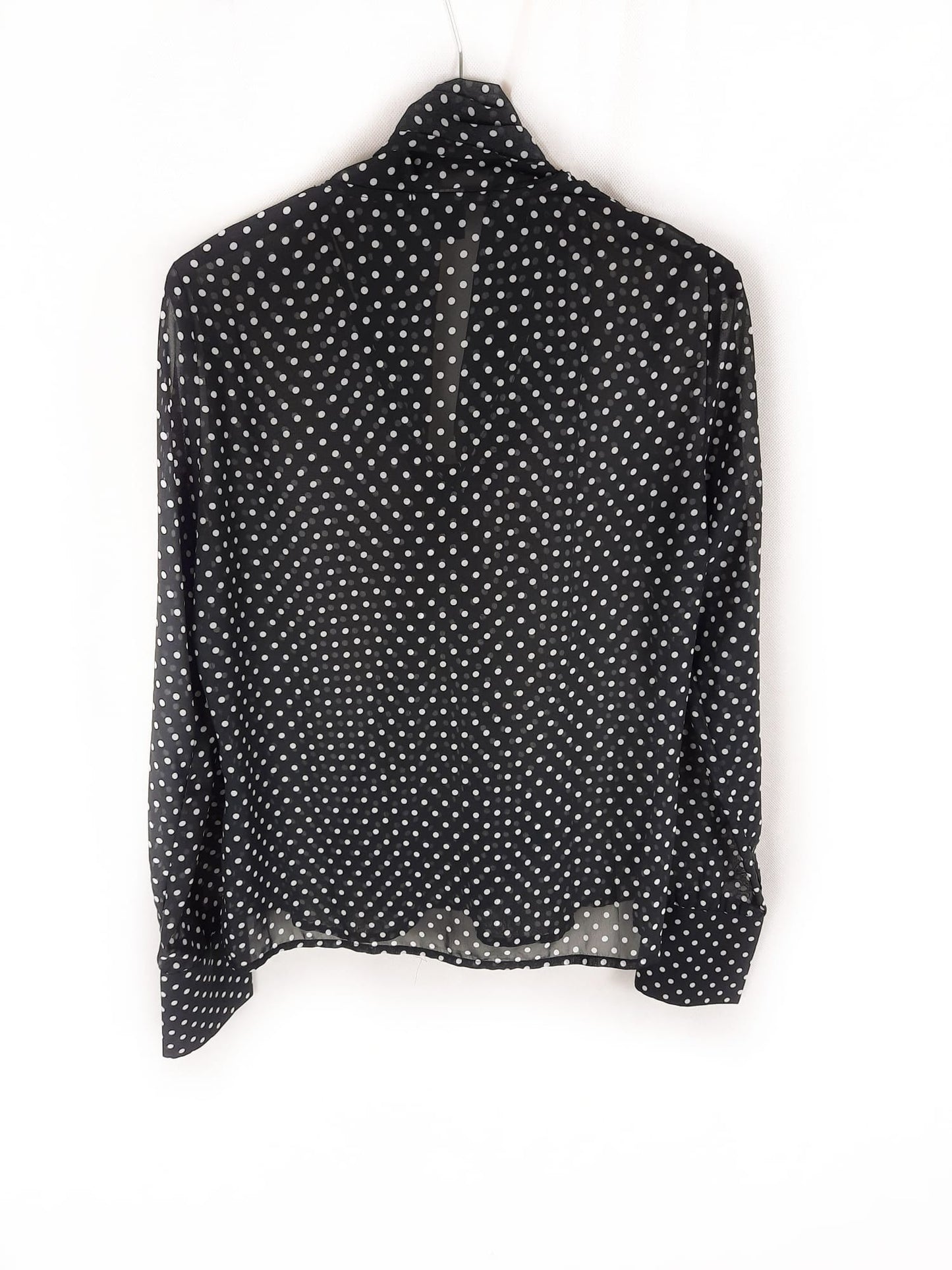 Blusa negra de lunares con lazada en el cuello. Semitransparente. No elástica. De sisa a sisa 50 cm largo 67 cm