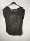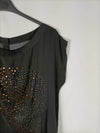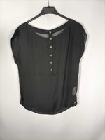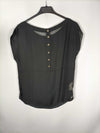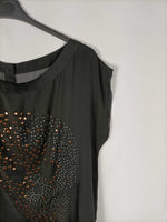 Blanco. Blusa fluida negra con estampado de calavera en tachuelas. Espalda abotonada. De sisa a sisa 53 cm largo 65 cm