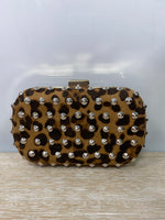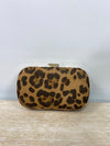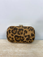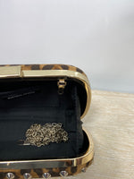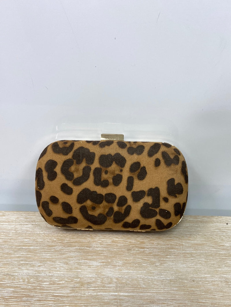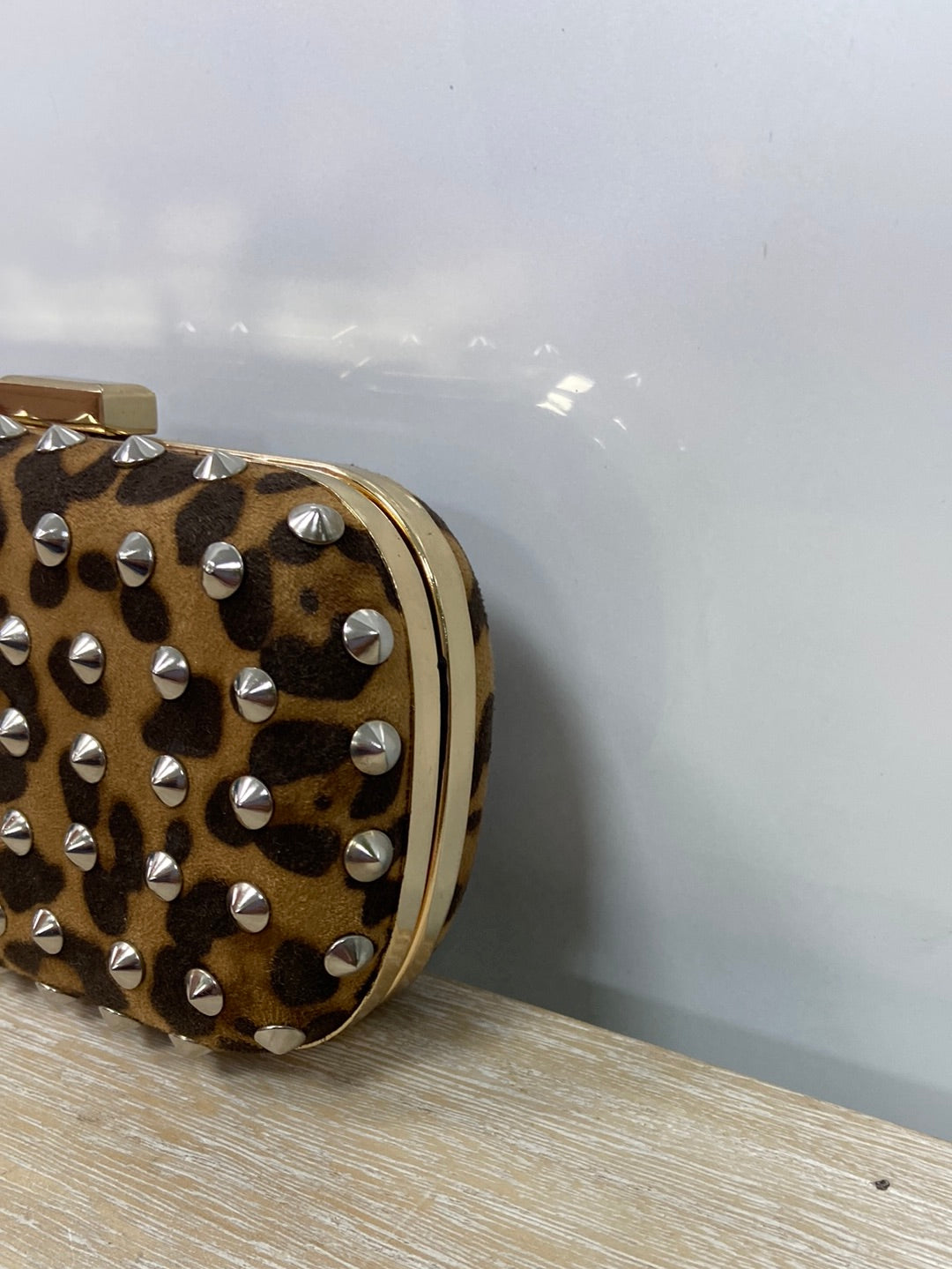 Bolso animal print de antelina con tachuelas plateadas, tiene cadena plateada de quita y pon. Largo 17 cm, alto 10 cm, ancho 4 cm