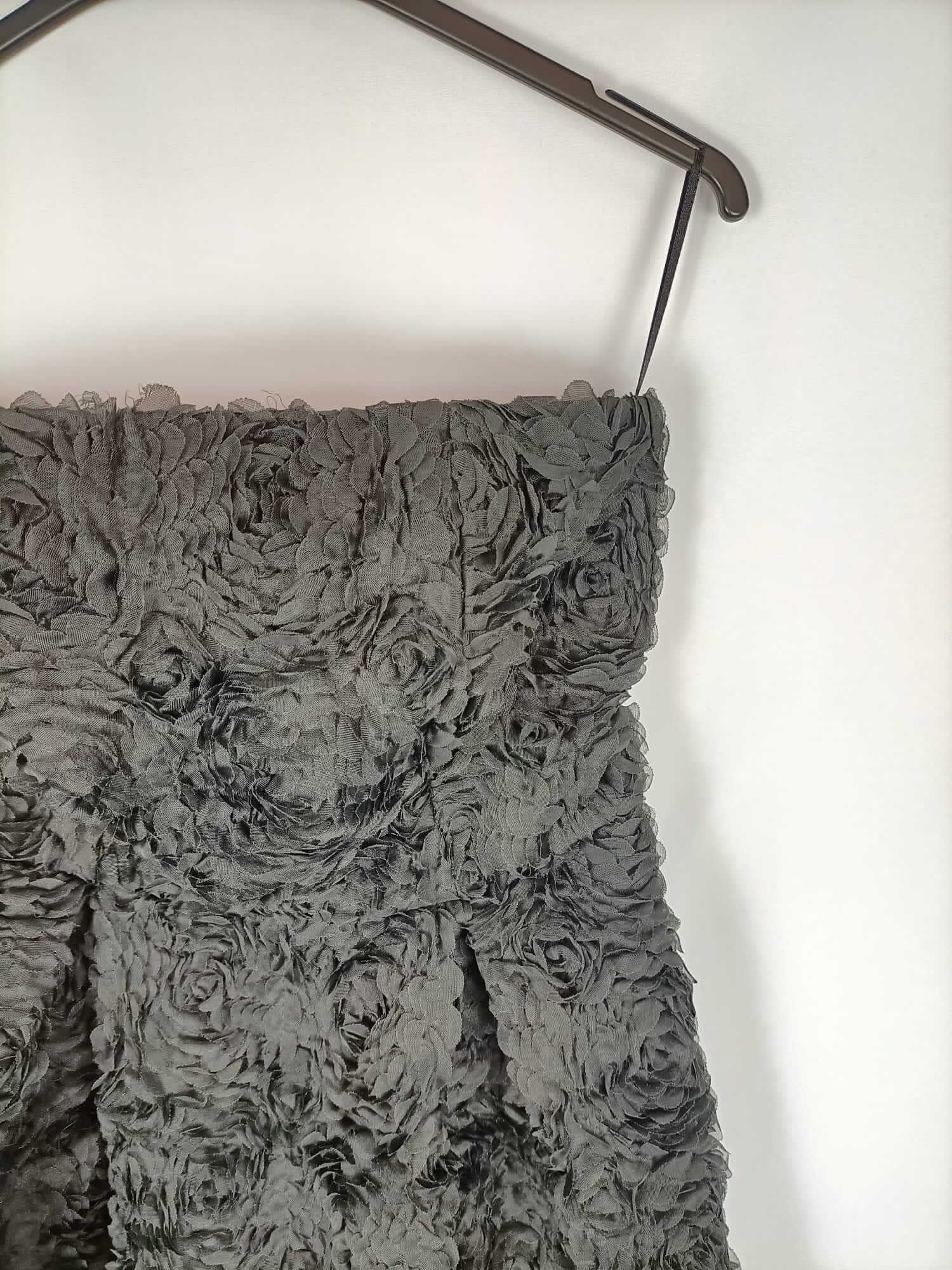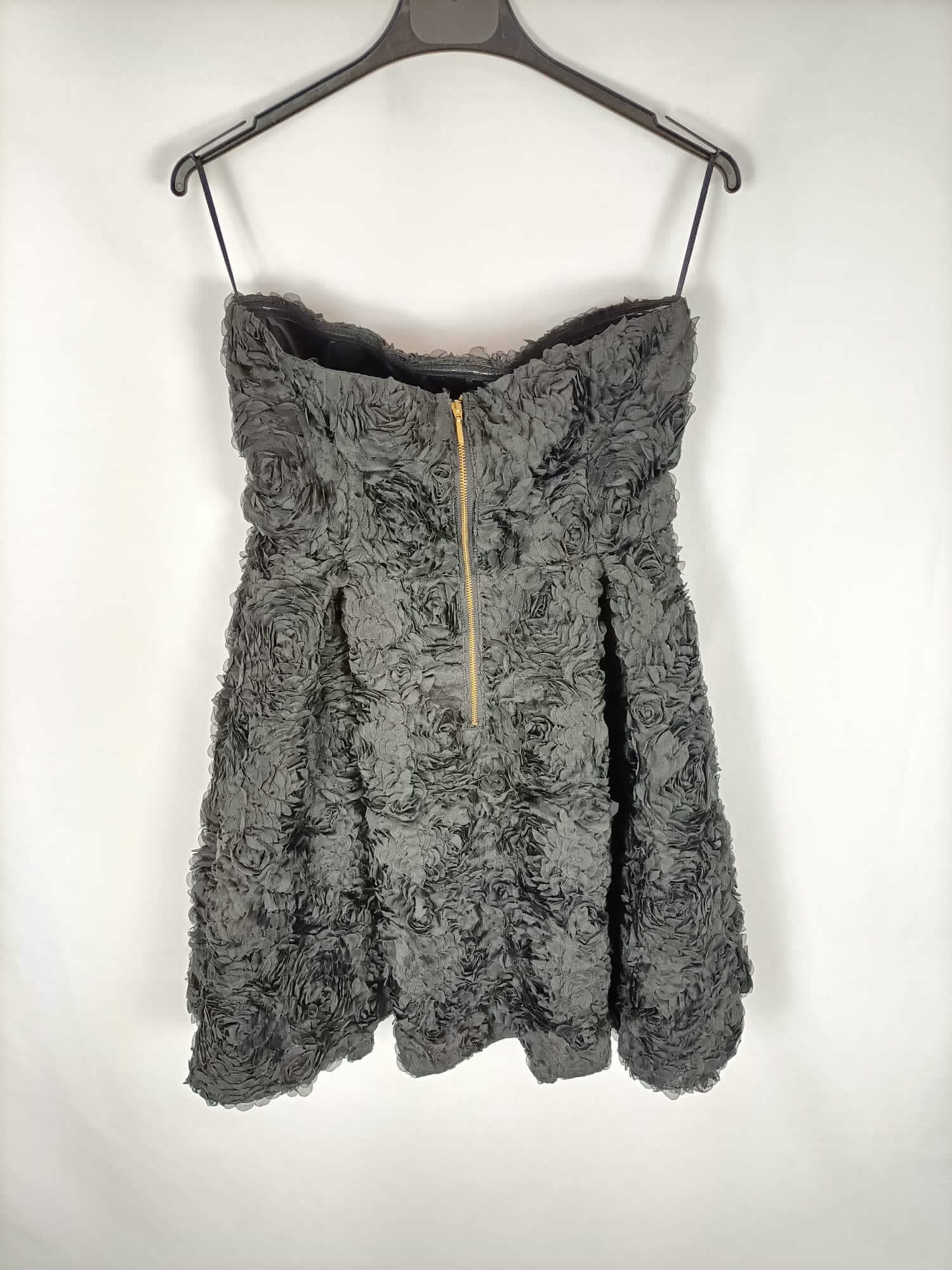 Blanco. Vestido corto negro de vestido palabra de honor con textura de flores. Tiene un poco de vuelo. Pecho 42 cm largo 64 cm