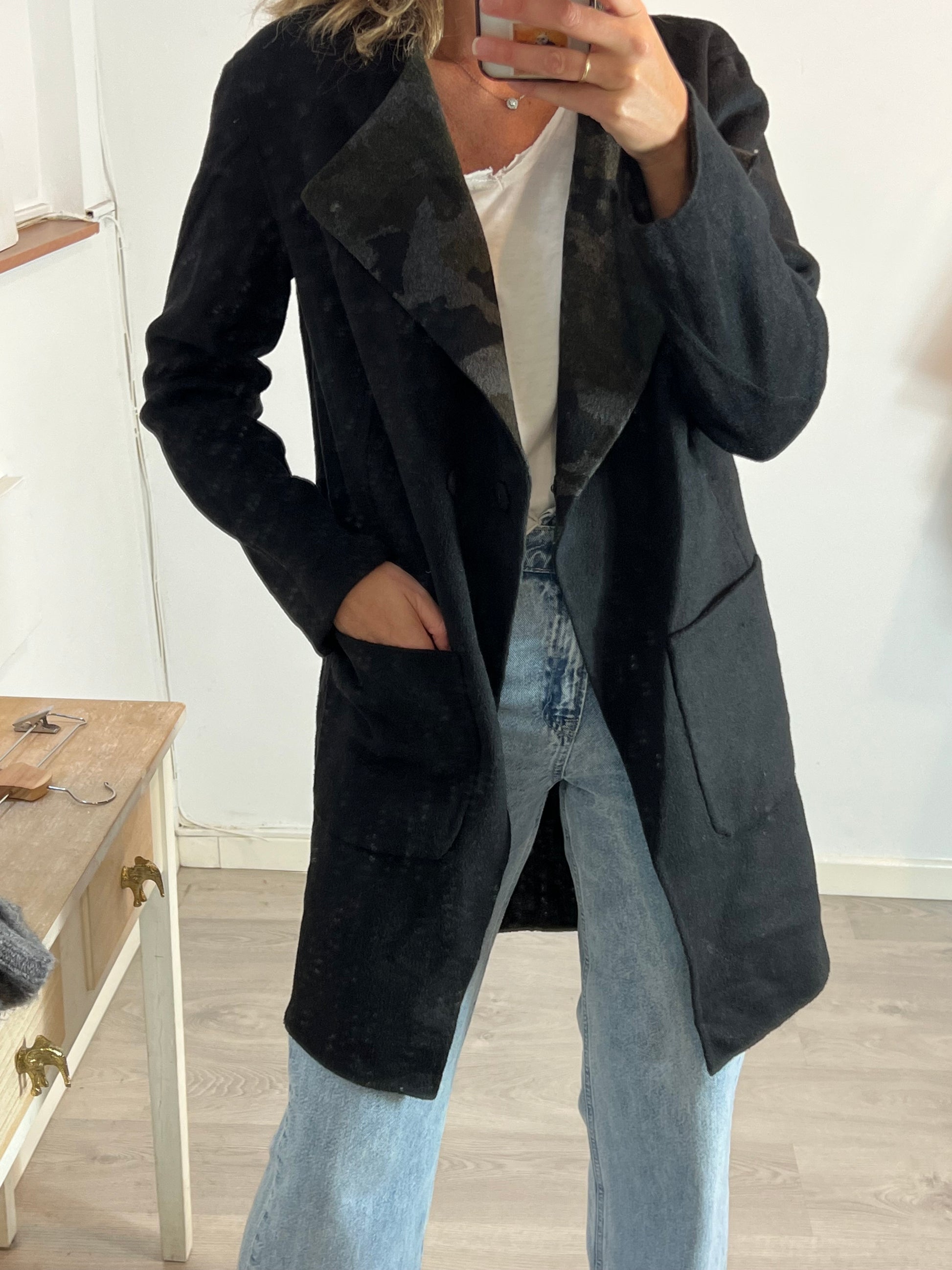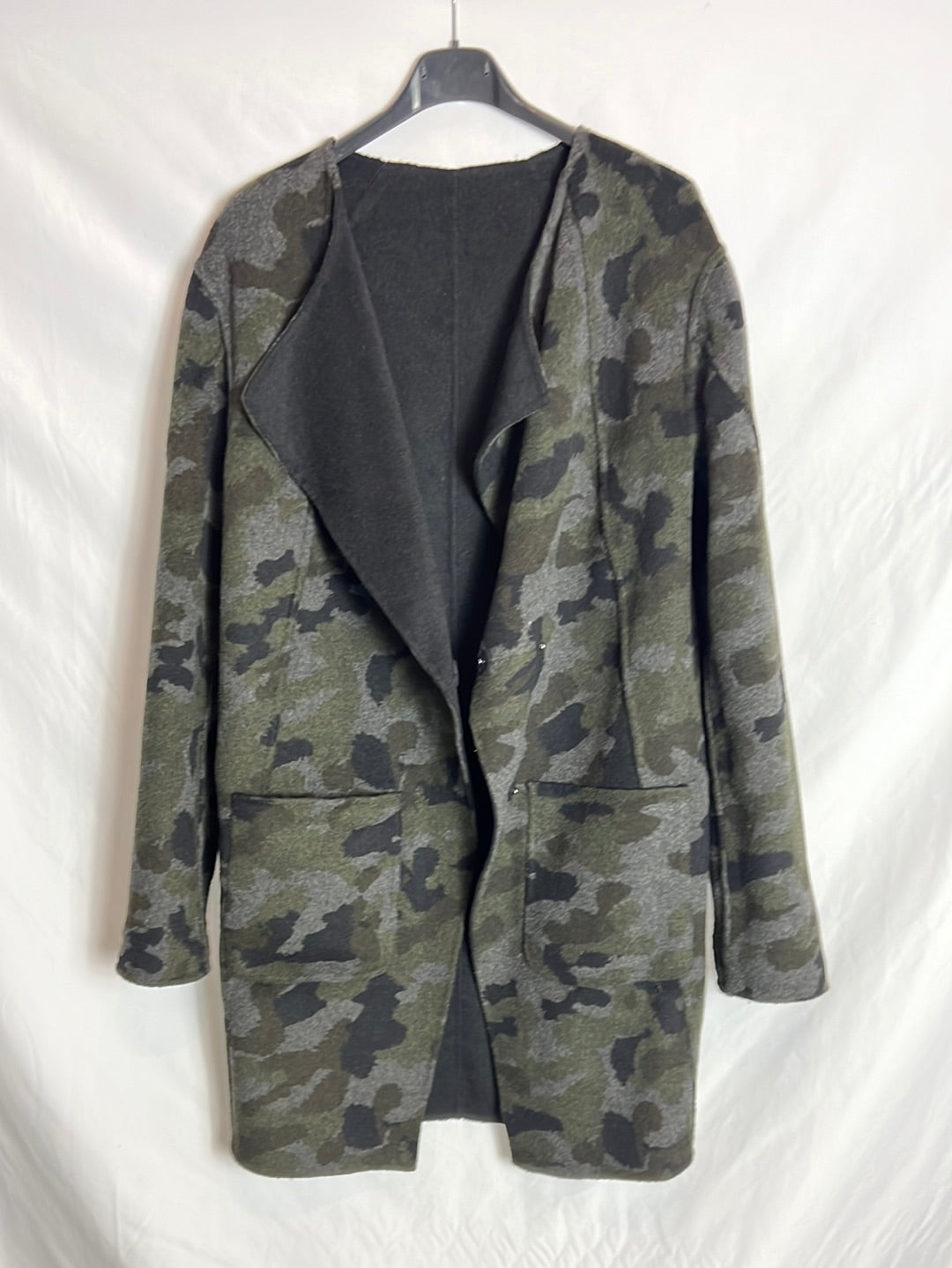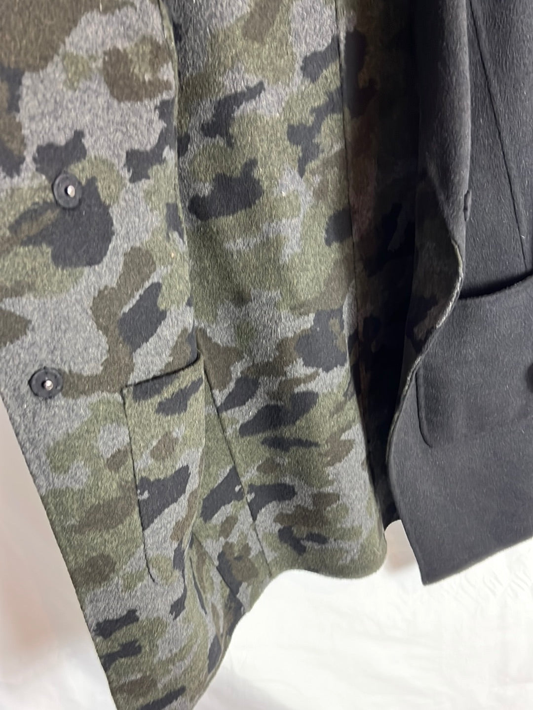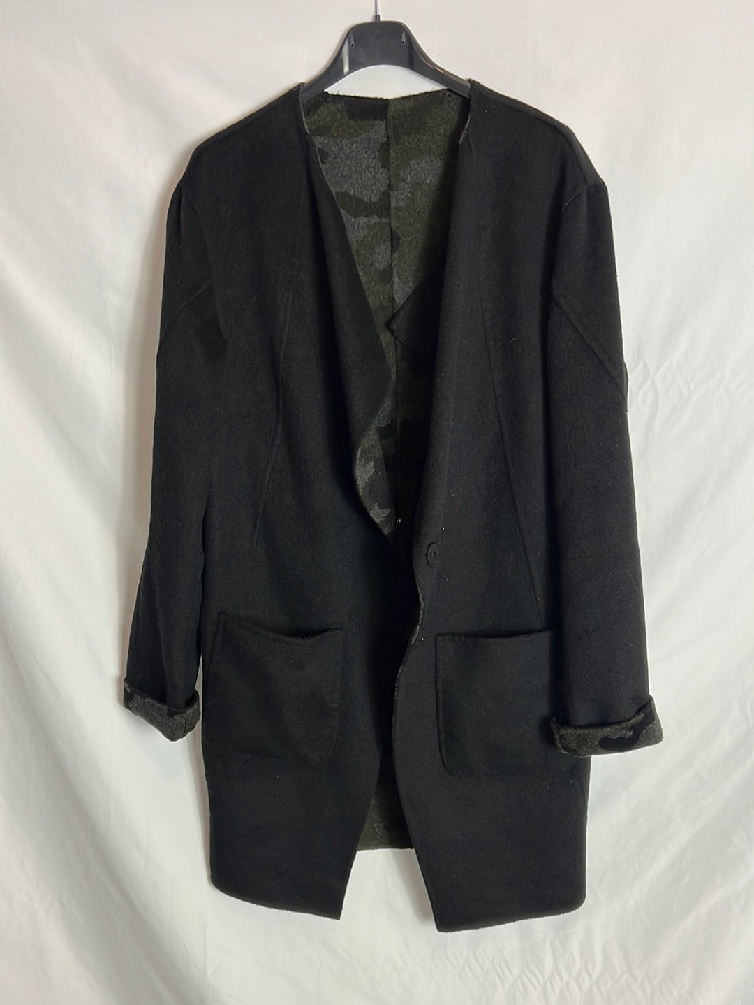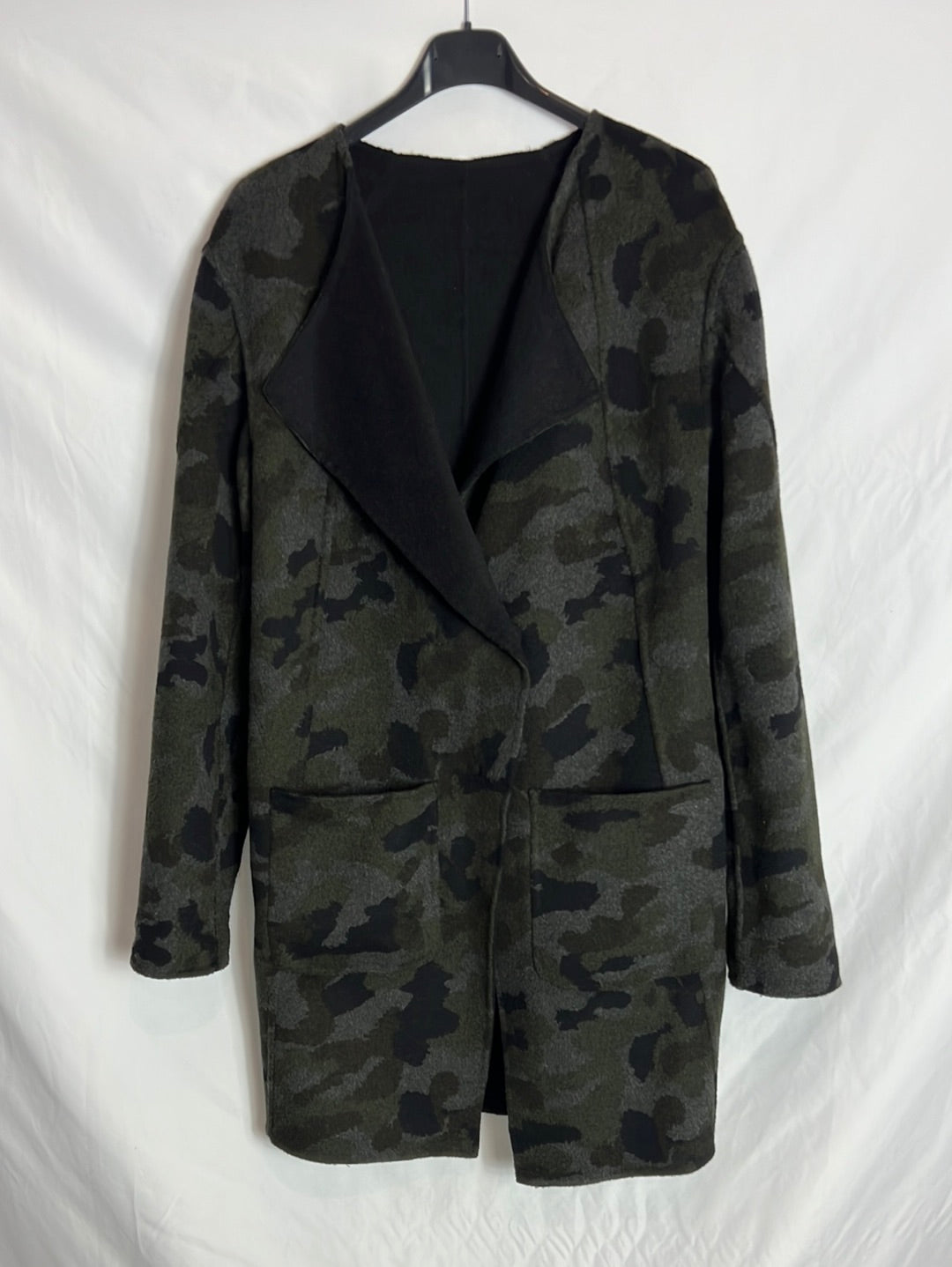 Abrigo negro y de camuflaje reversible. Hombros 45cm, de sisa a sisa 54cm, largo 90cm
