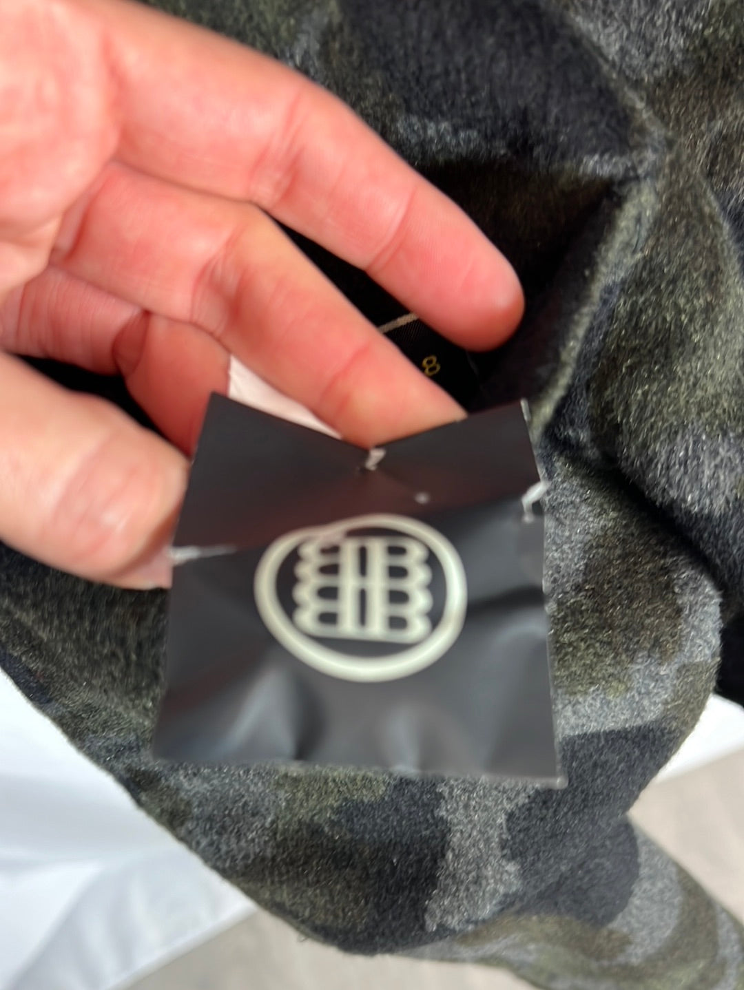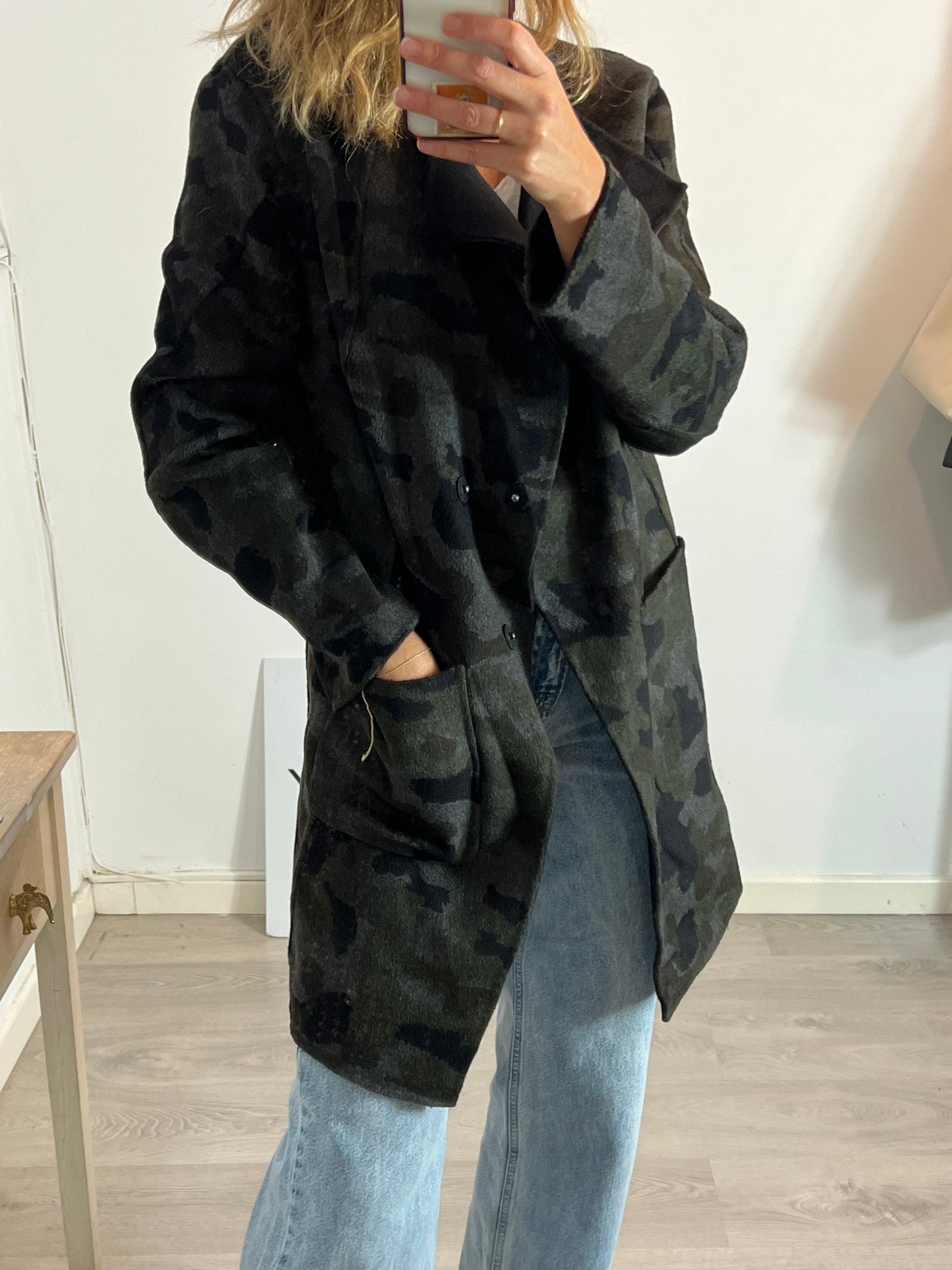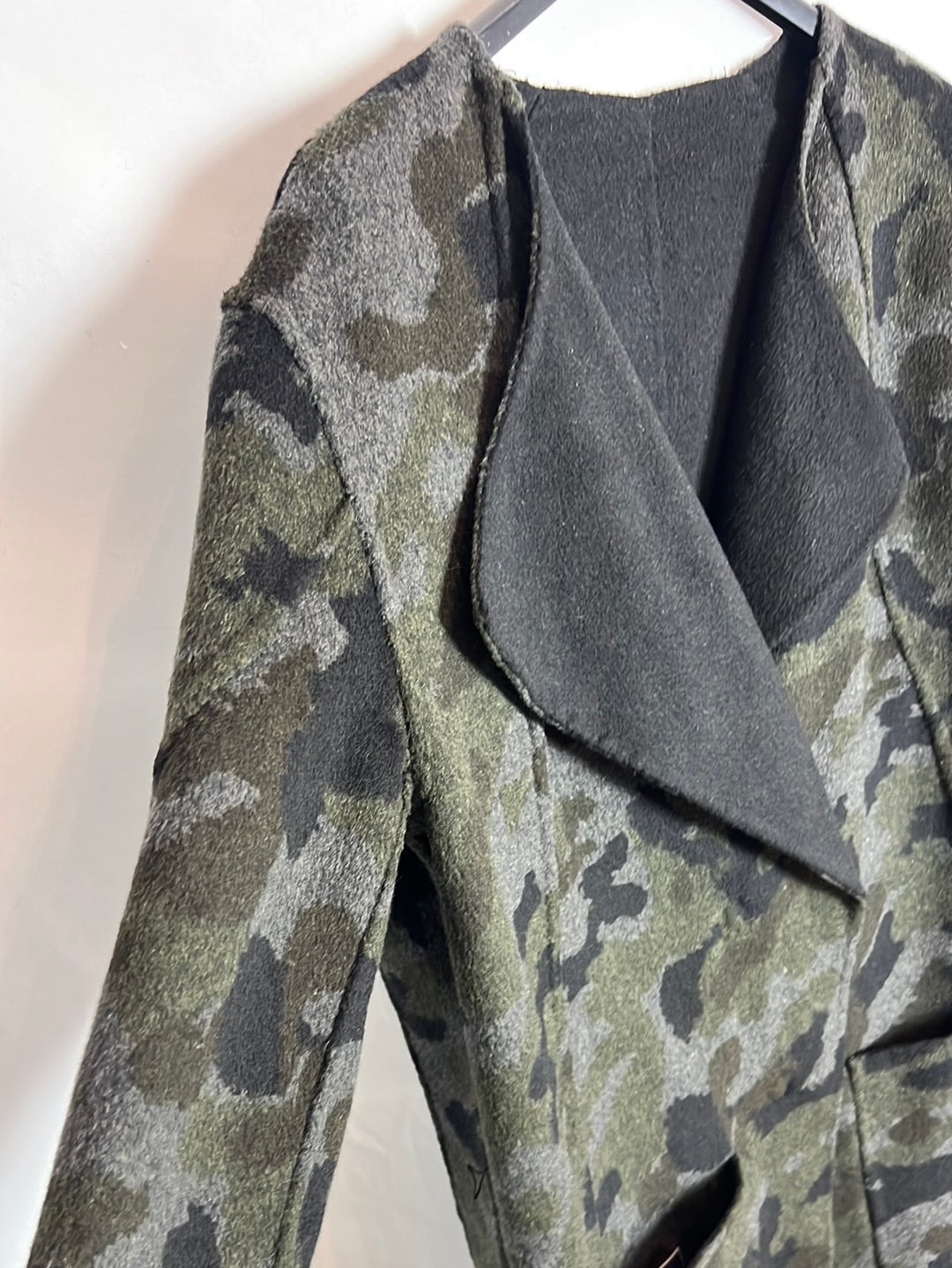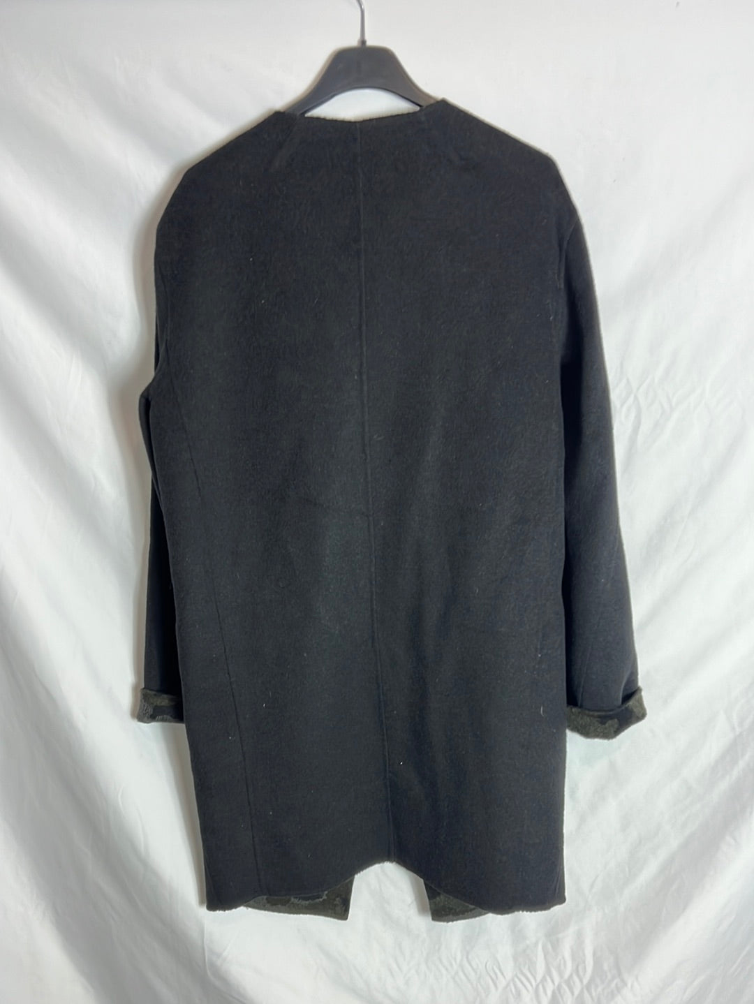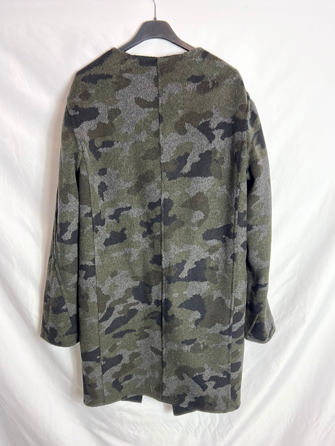 Abrigo negro y de camuflaje reversible. Hombros 45cm, de sisa a sisa 54cm, largo 90cm