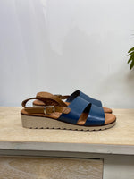 Sin estrenar. Sandalias de piel en tono azul y marrón con suela de goma. Tacón 3 cm