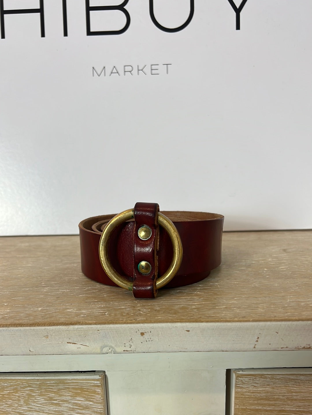 Cinturón marrón de piel hebilla dorada redonda. 90 (105 cm)