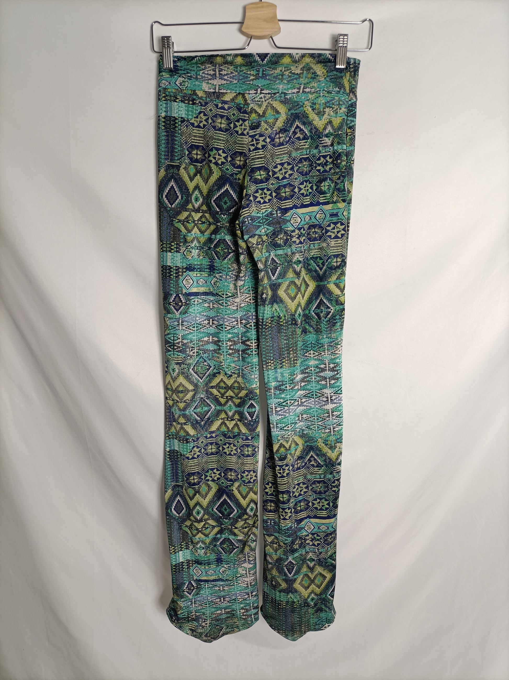 Pantalón estampado tonos verdes y azules de tejido elástico. Entallado y de campana