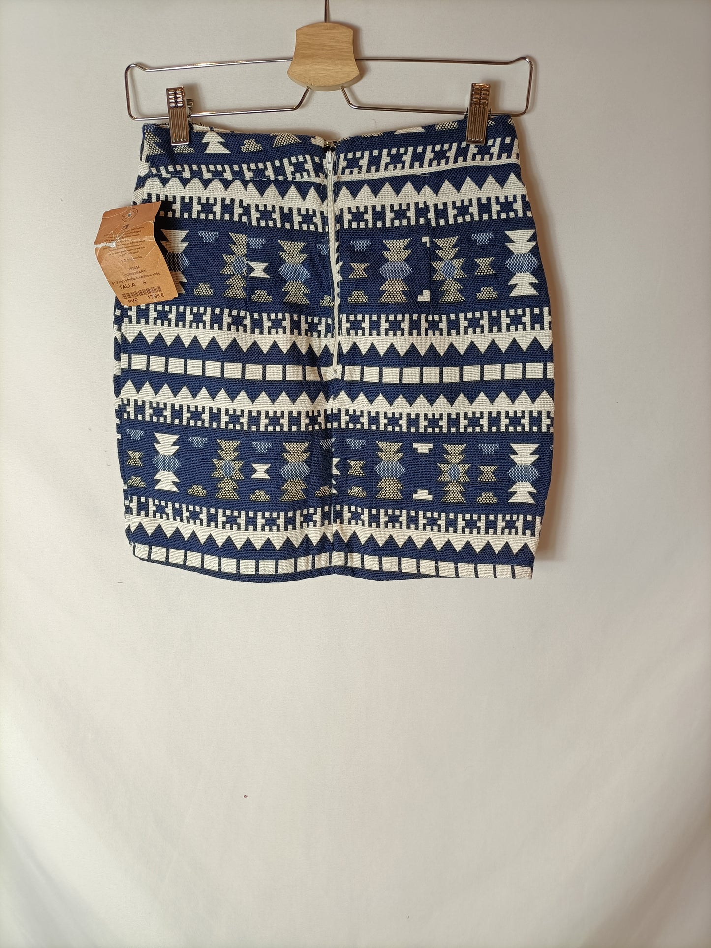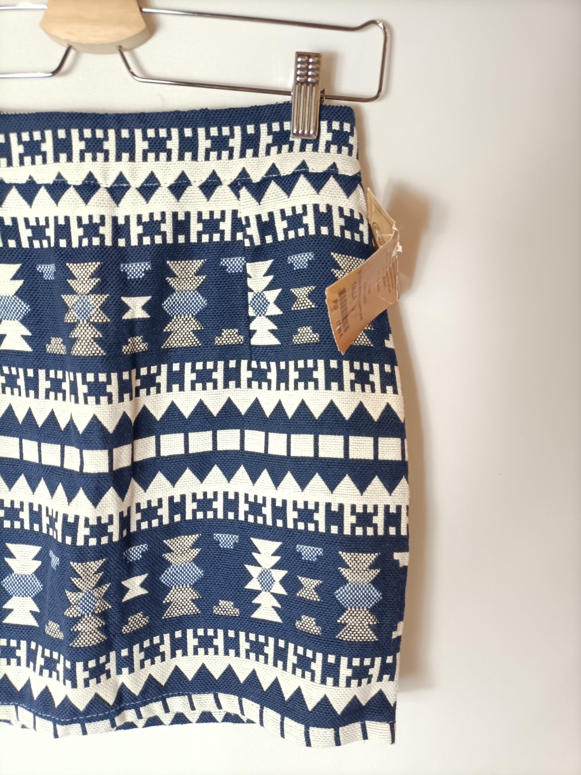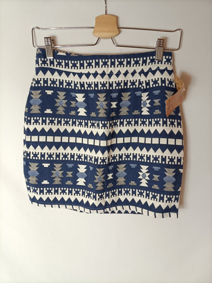 NUEVO CON ETIQUETA. Falda corta azul y blanca con estampado étnico.