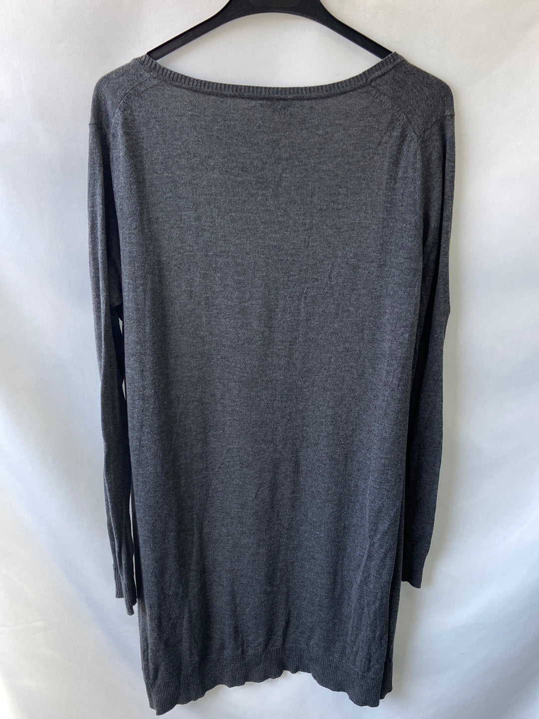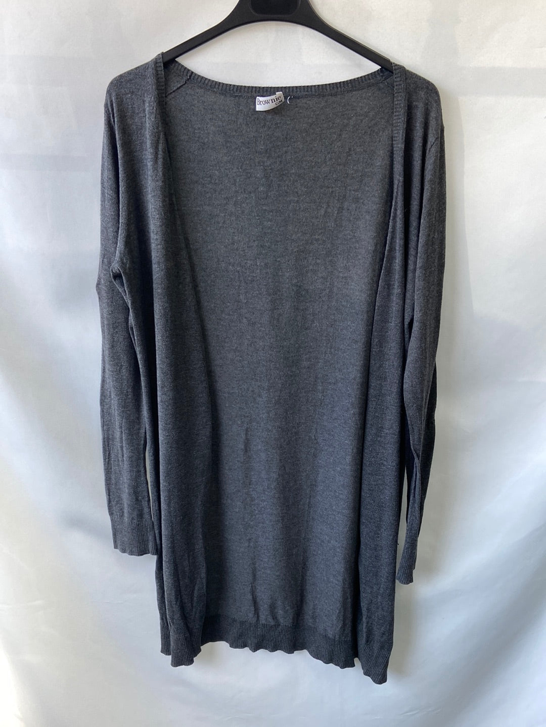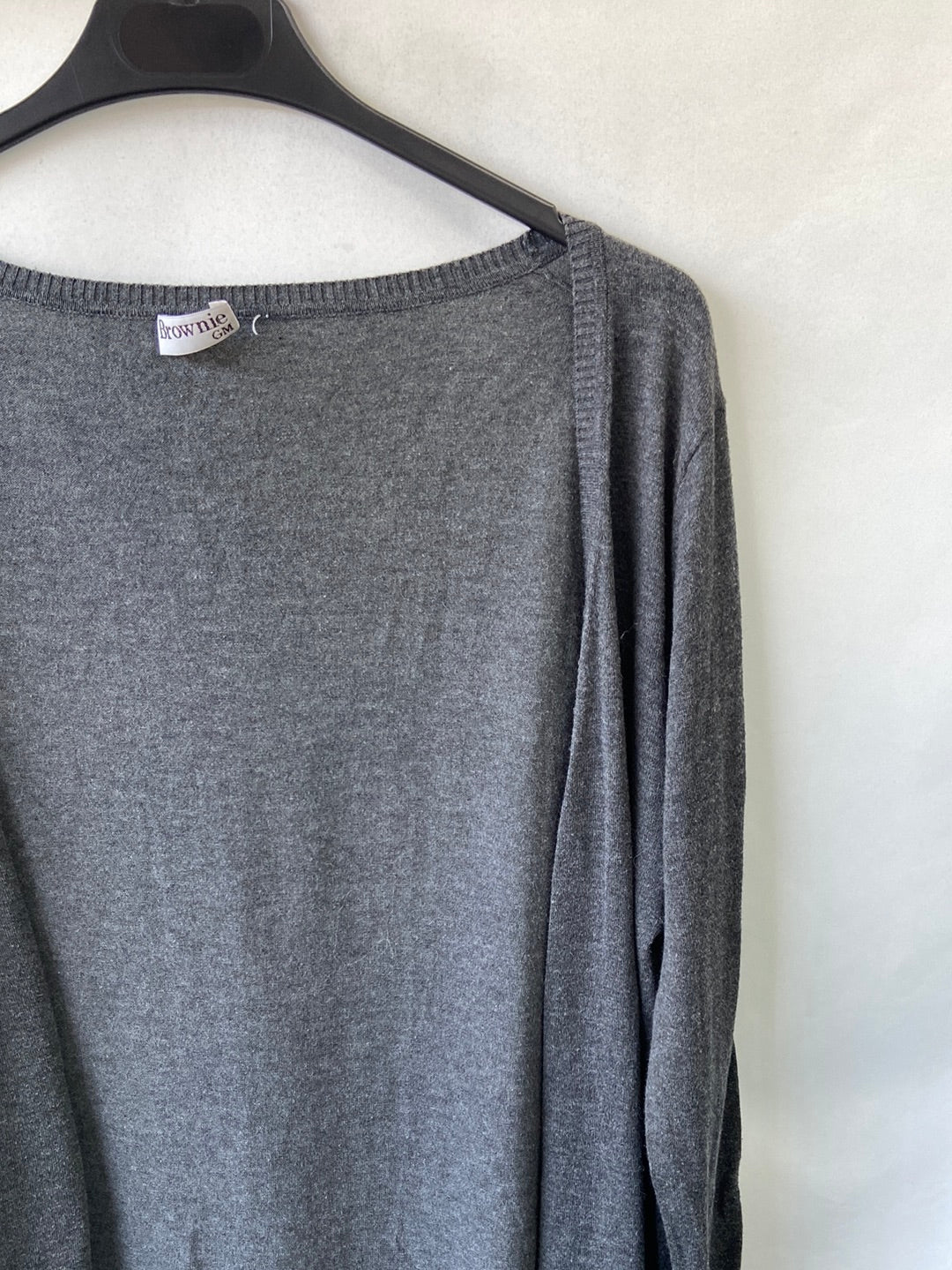 Brownie. Rebeca gris larga elástica abierta. Tara. Le falta un botón. Largo 94 cm