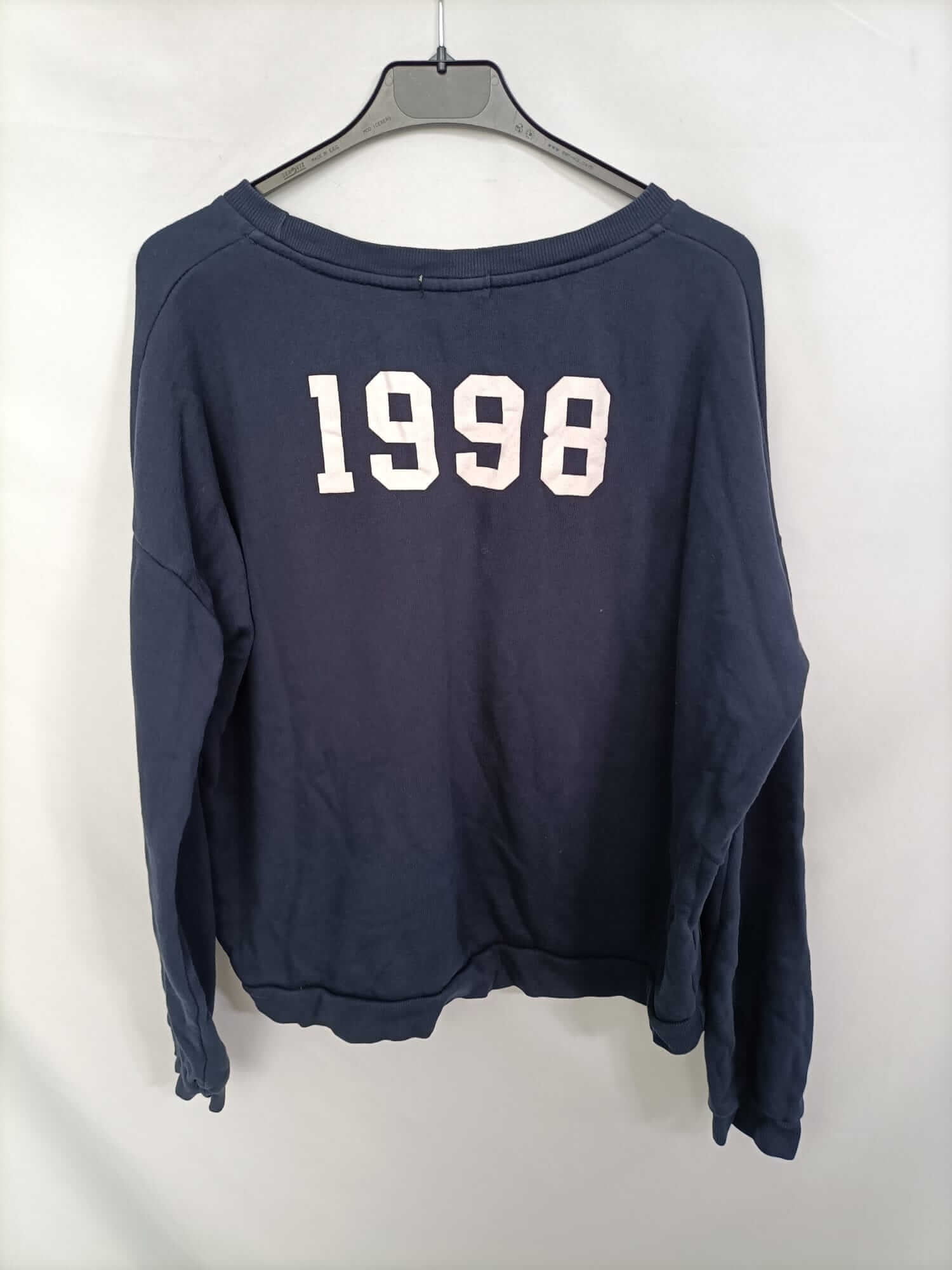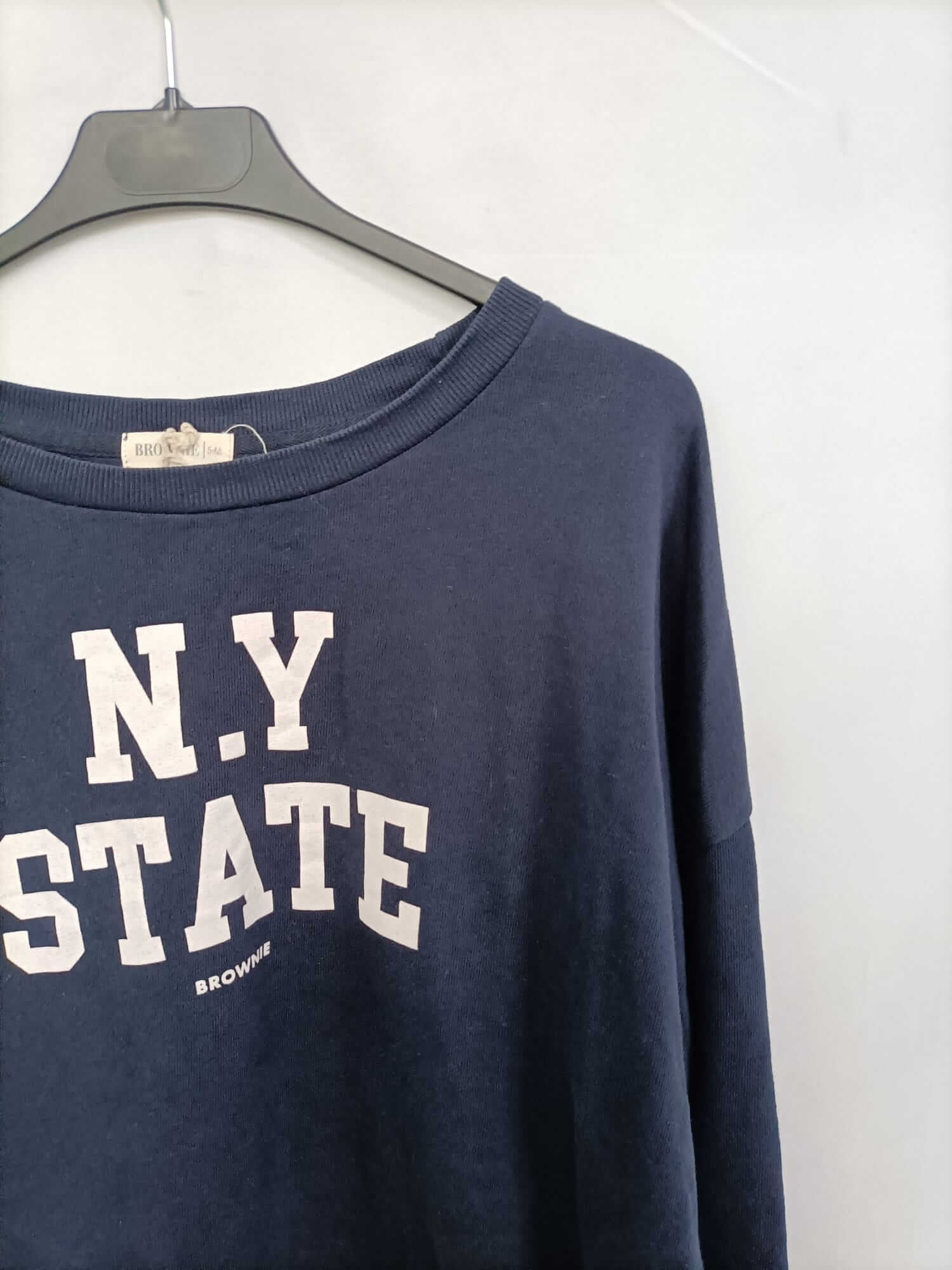 Brownie. S/m. Sudadera azul con letras blancas. Elástica con Interior de forrito. Largo 58 cm