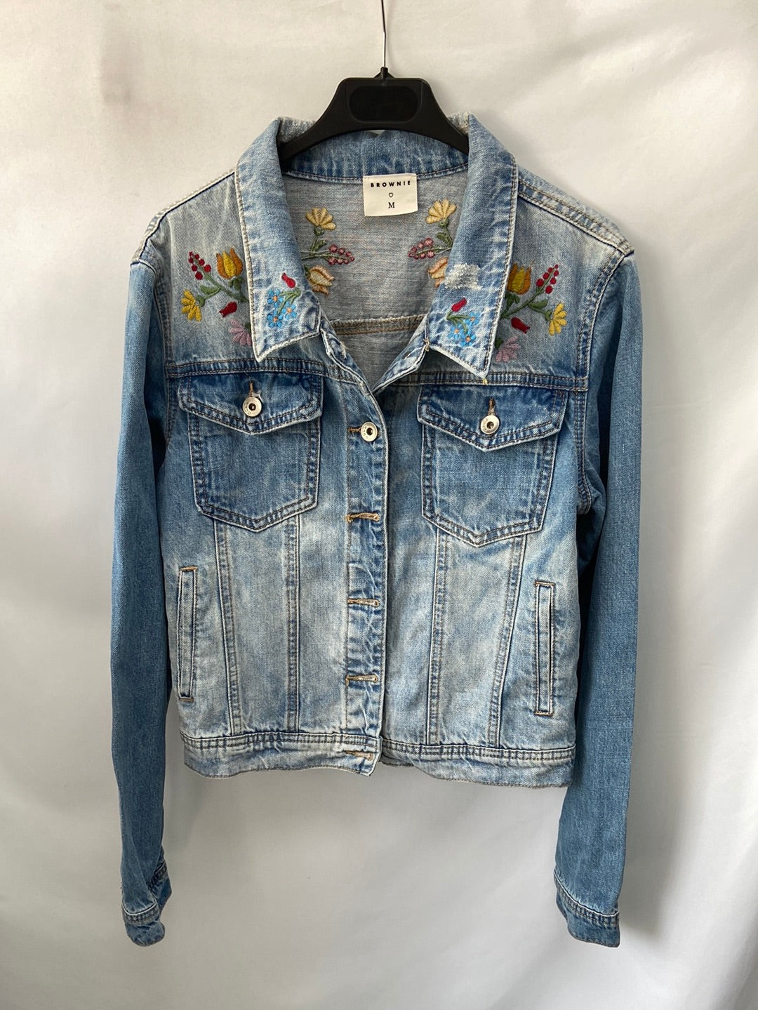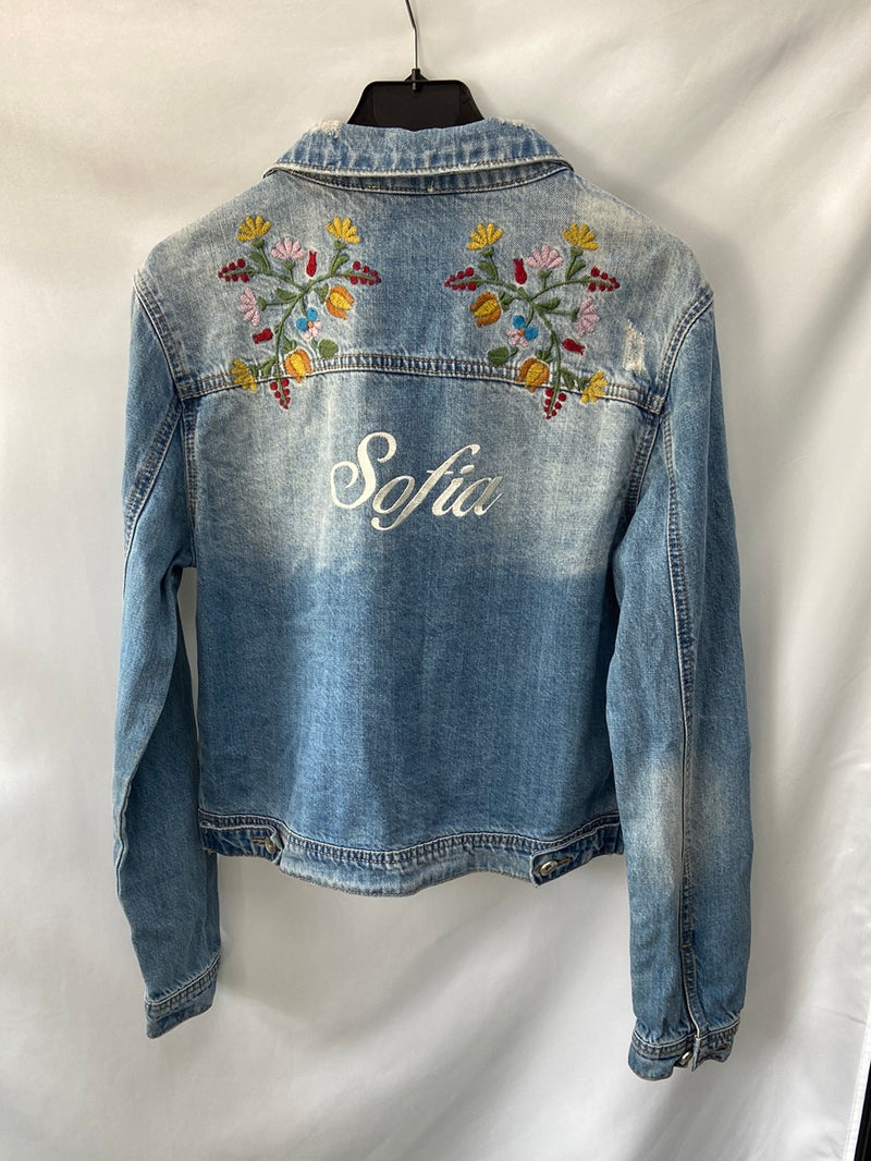 Chaqueta denim bordada personalizada con el nombre Sofía. De sisa a sisa 50 cm largo 60 cm.